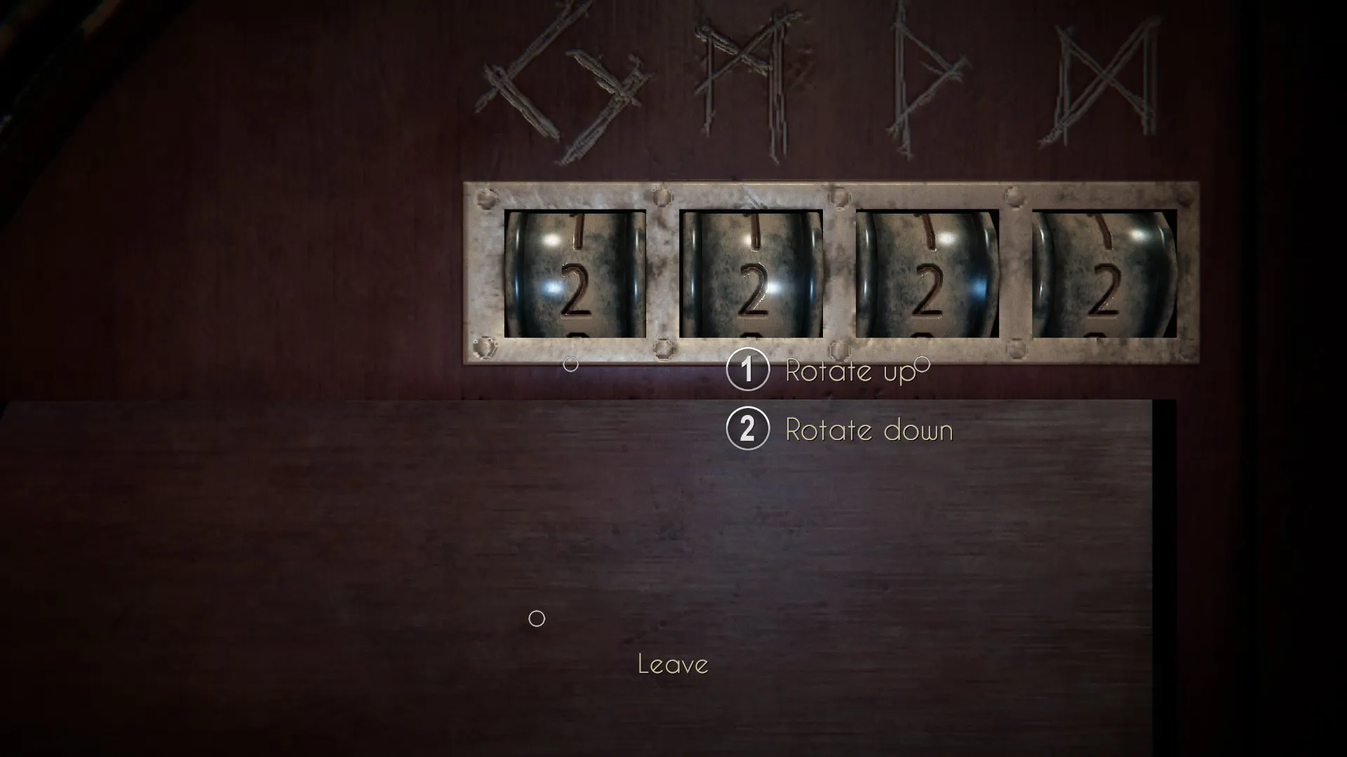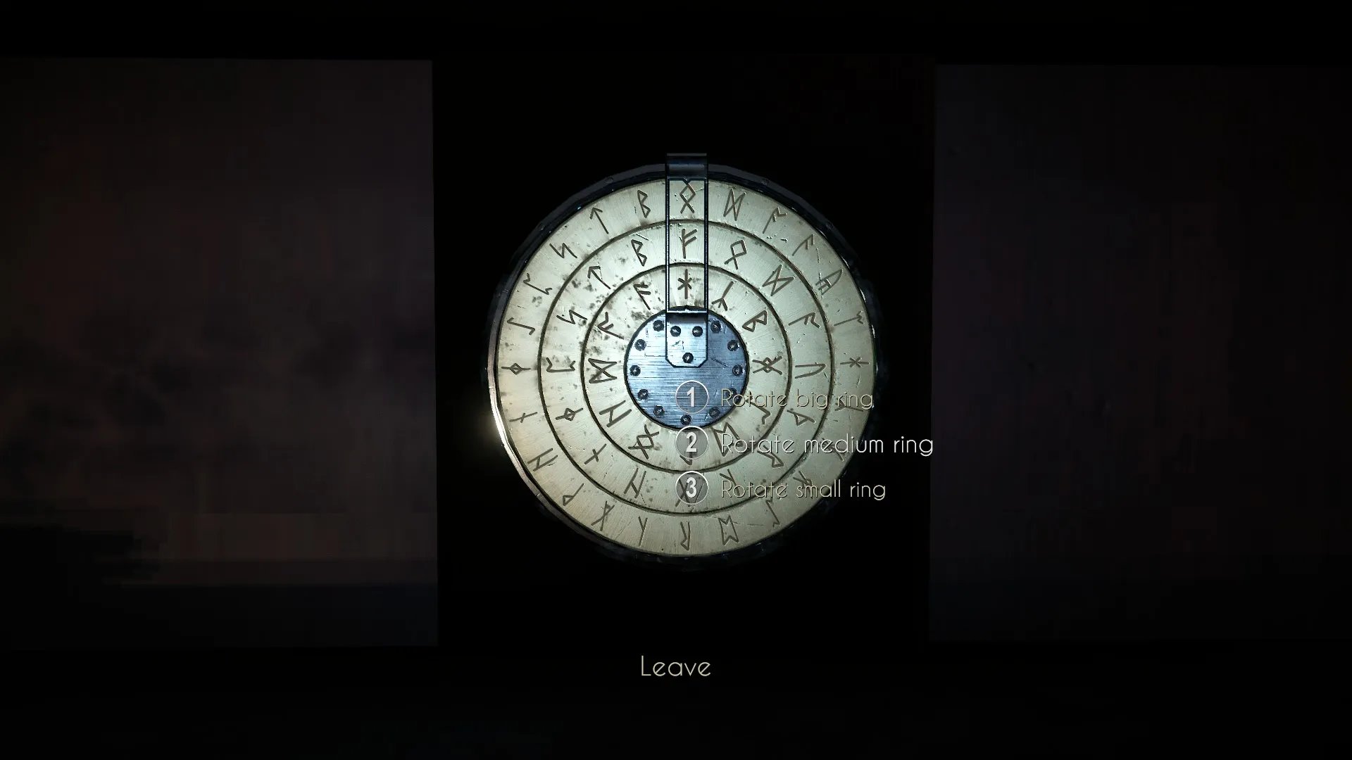 Leave the desk and head over to the book case on the left. There you’ll see a dial with runes. This is where the clue comes in. Luckily, this one’s a bit more simple than the last rune puzzle. There’s no math involved. Instead, take a look at the left side of the bookcase. There you will find five runes. The numbers on the clue you just found correspond with the runes on the side of the case. You’ll be able to look at them more closely by moving the camera while zoomed in. Rotate the dials until all three correct runes are aligned at the top, keeping in mind that the runes on the side of the case are ordered 1-5 from top to bottom. Once the dial is set right, you’ll get another cut scene and find yourself looking at a miniature version of the house.