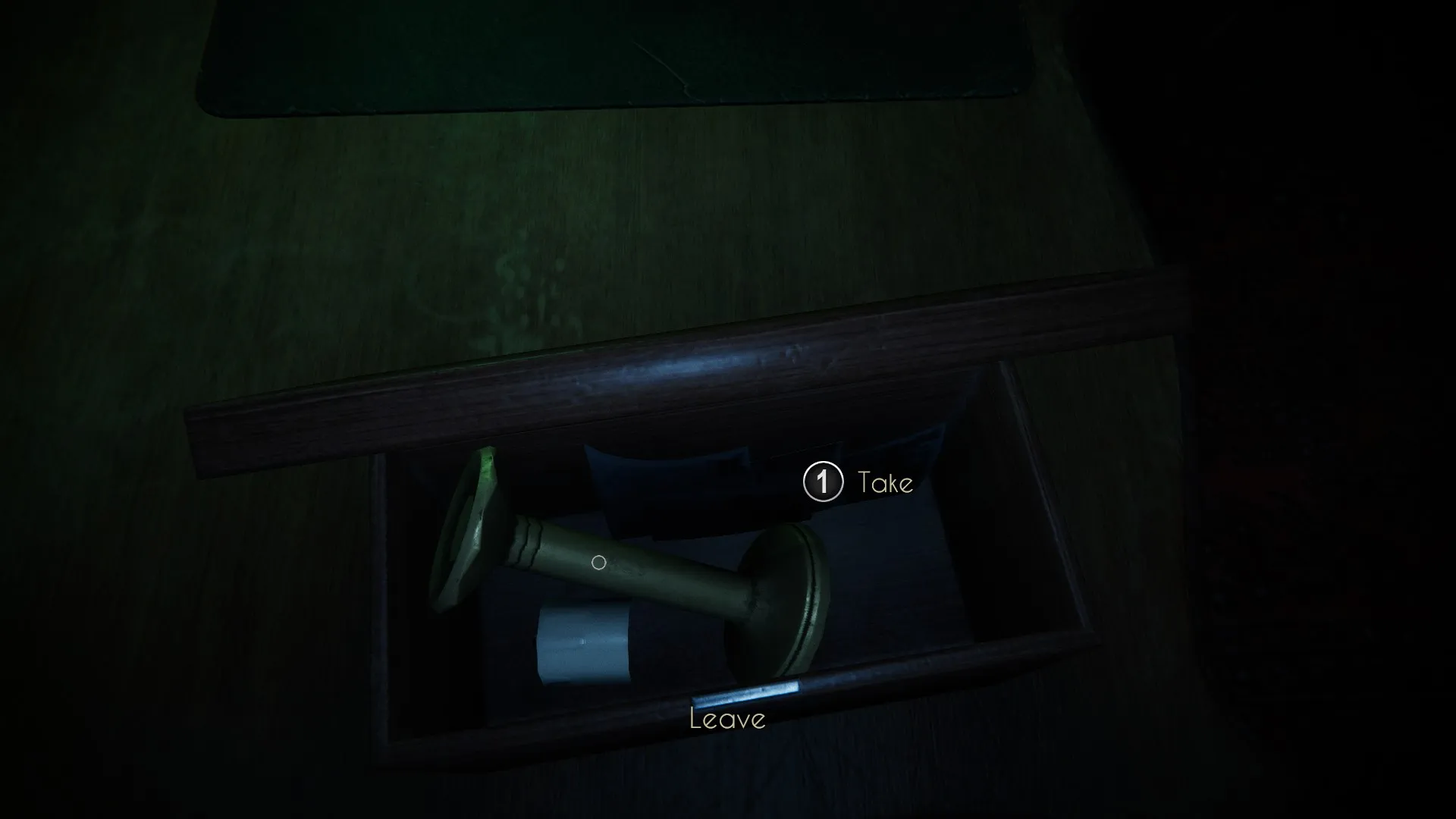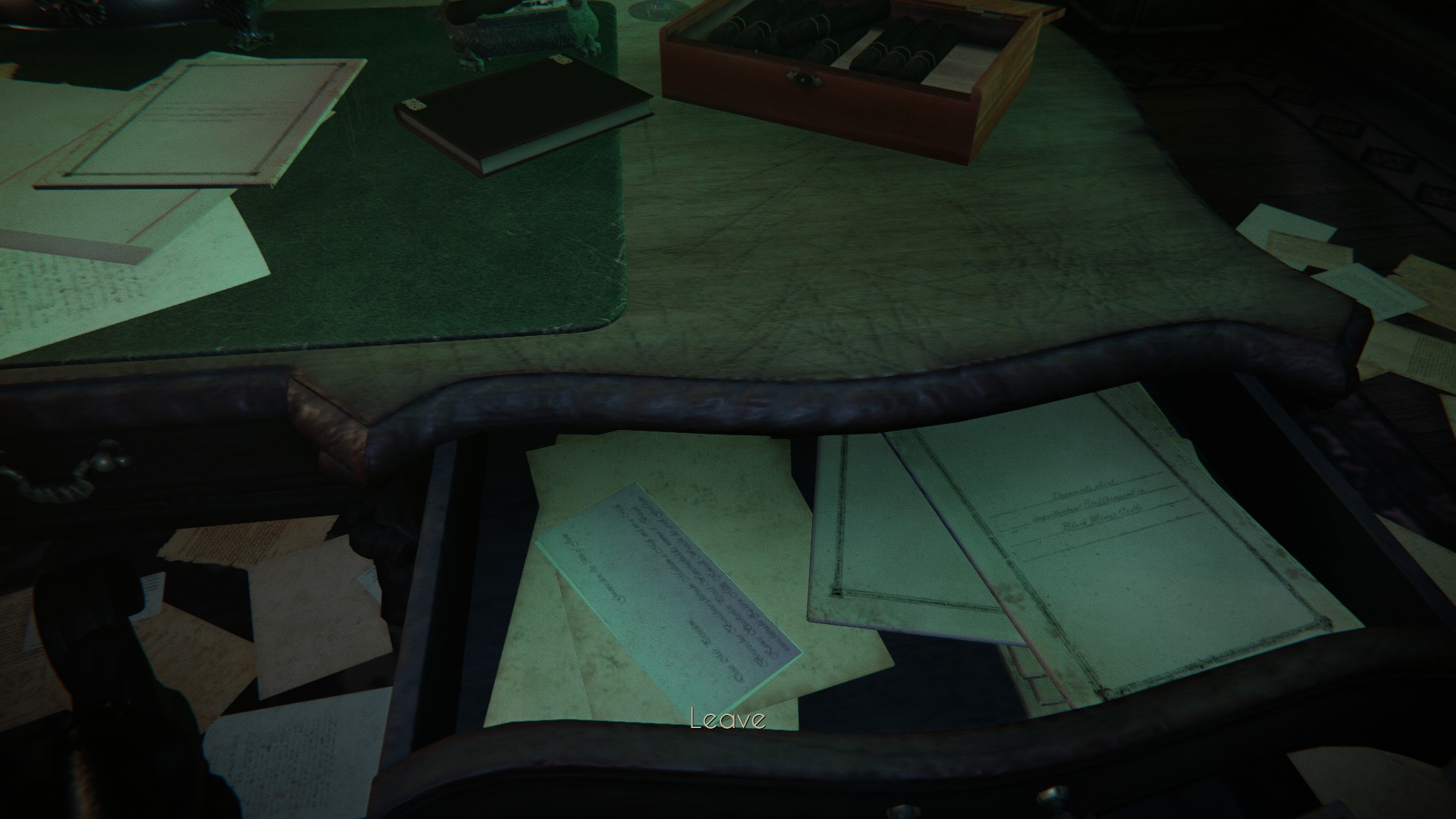 Back at the desk, you’ll now have options for opening the desk. If you grabbed the wire, use it. This will allow you to obtain the “No Scratches” achievement. (You’ll need to hold down the mouse button with this option.) Now that the desk is open, you can take a closer look.