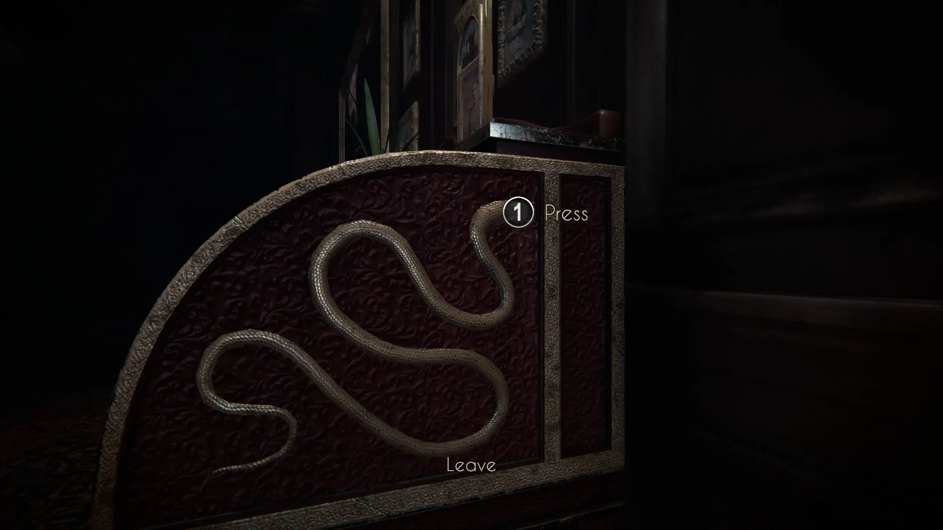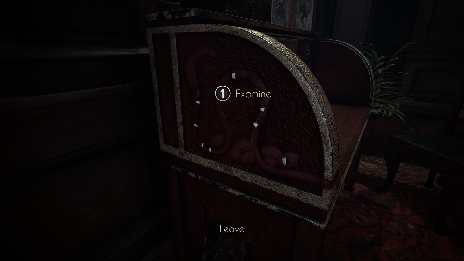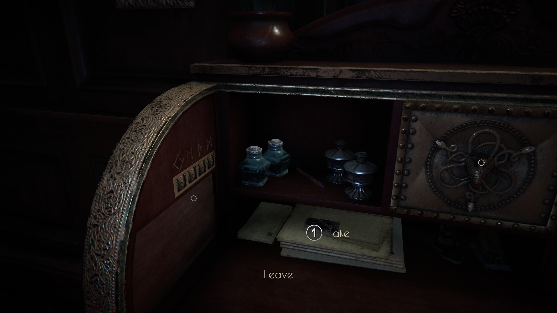 Finally, to finish opening the desk, you’ll need to look at the right side. Again, there’s a snake design. But in this case, all you need to do is press the button on its head.
