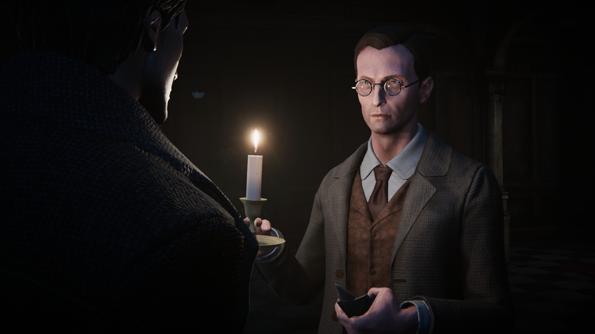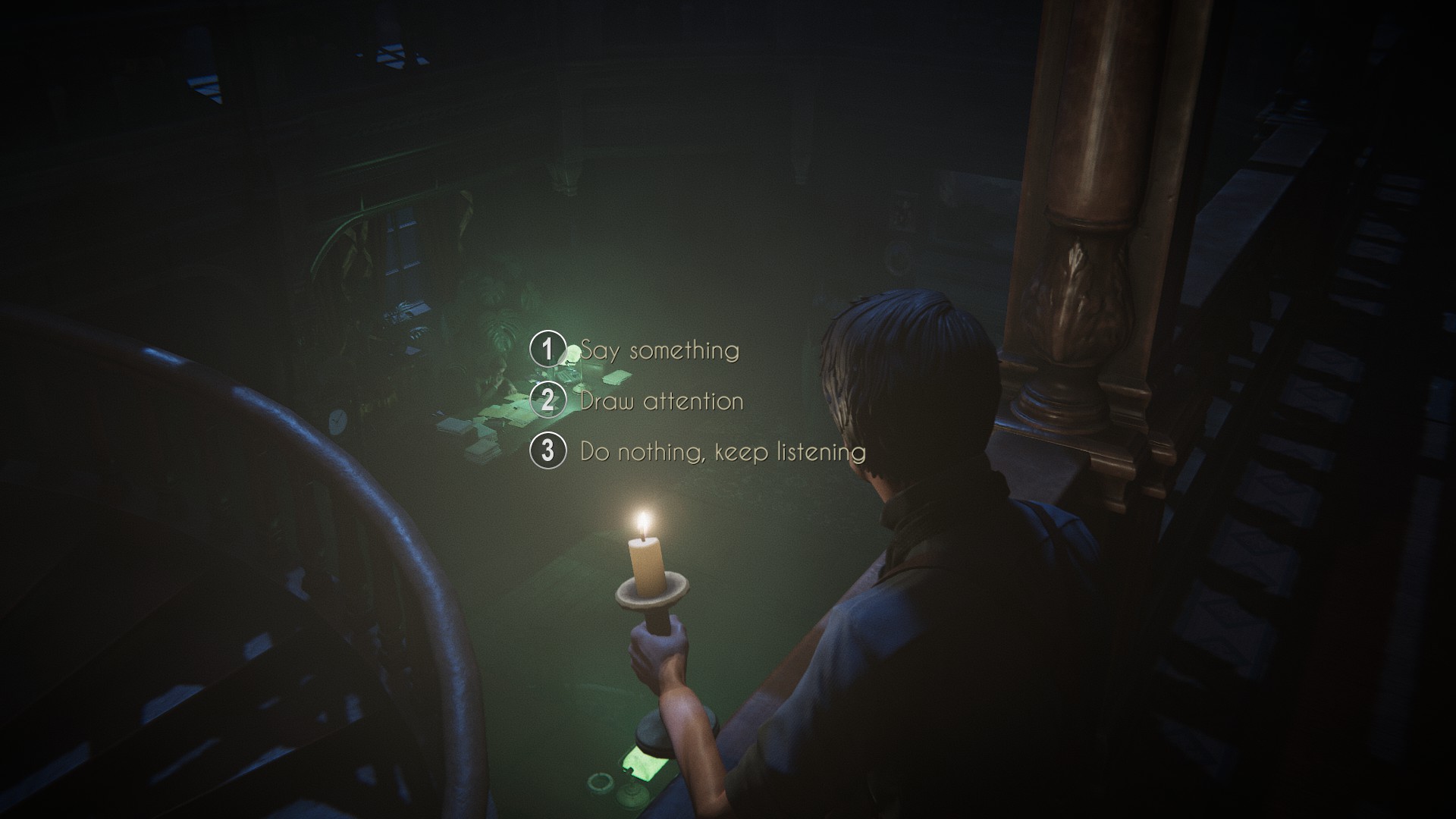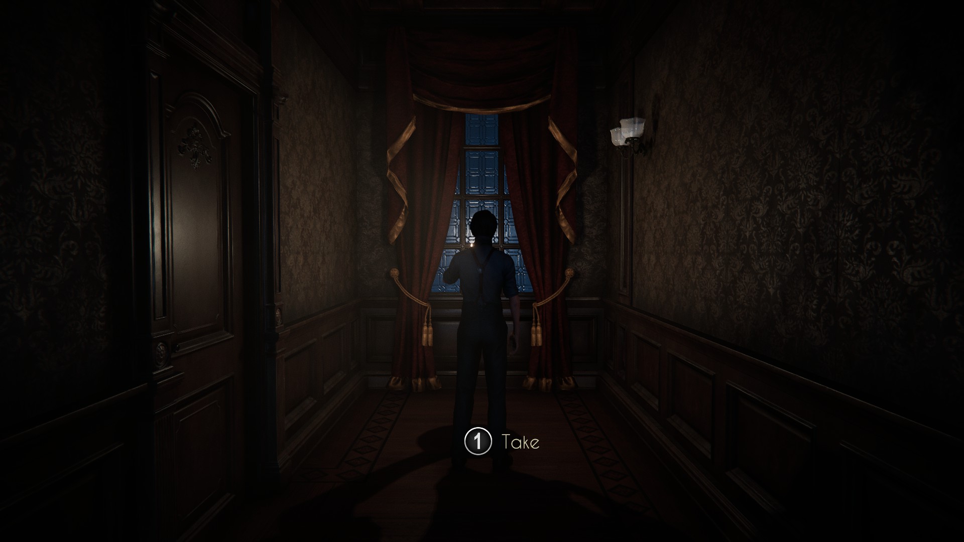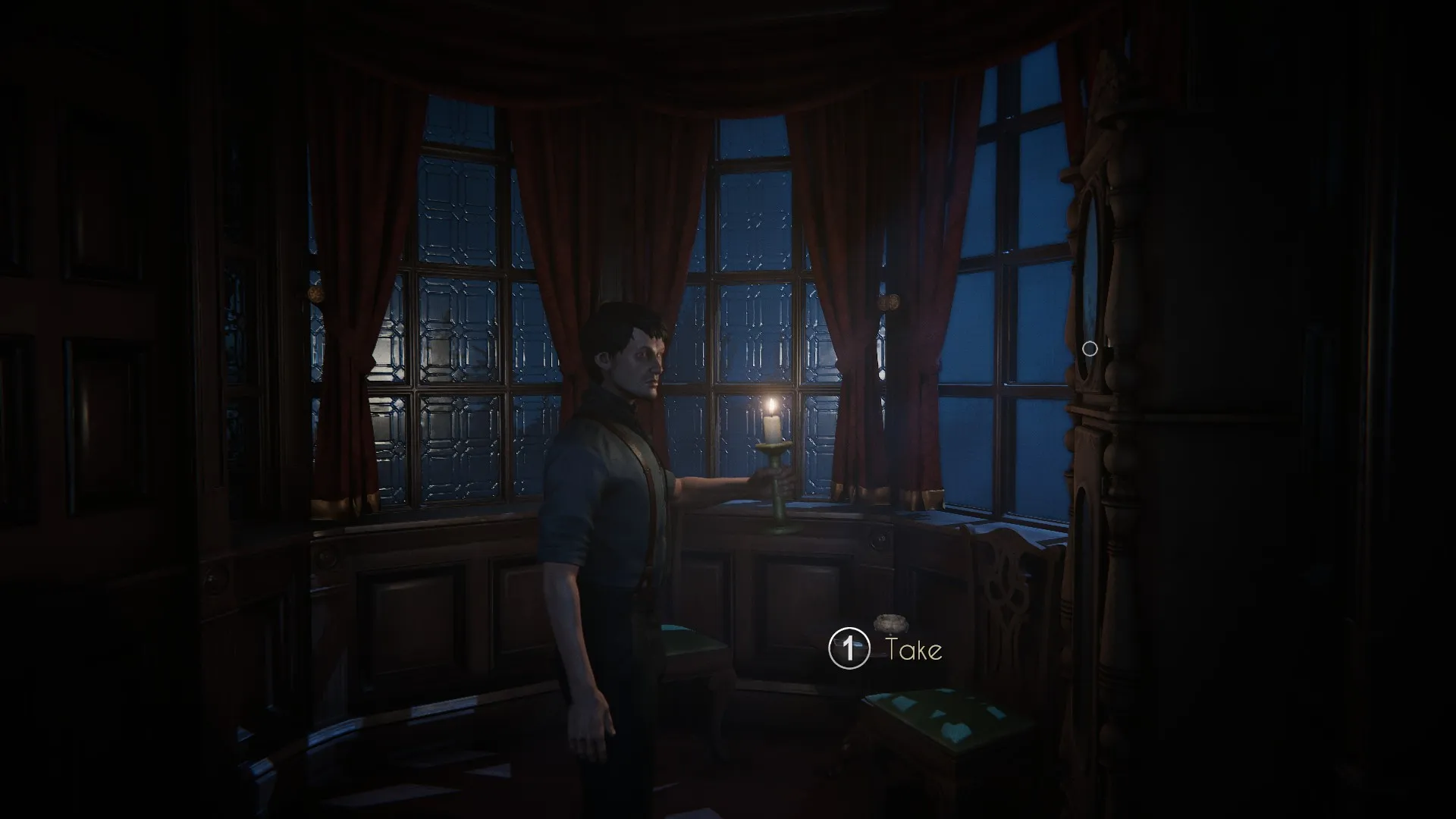 Continue to follow Angus to your room. Before getting there, you can comment on the peeling wallpaper if you like. Otherwise, just get to your door and wait for Angus to open it. While you wait, you’ll hear a noise and look around, spotting something in the distance before being startled by the clock next to you. Once in the room, Angus will advise you to not wander about at night — advice you obviously don’t plan to take.