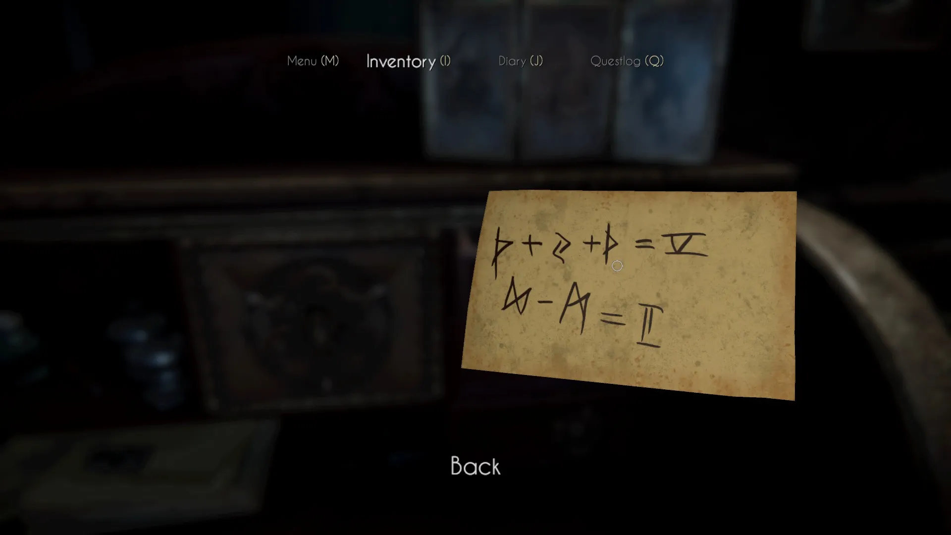 On the left side of the desk, you’ll find more drawing pieces. To the left of them is a panel that can be investigated, but you’ll have to figure out the combination in order to get into it. Luckily, it’s written there for you . . . in runes. This is where the clue you just found comes in. It’s a basic math puzzle. The way to solve this is in the story-spoiler-free puzzle solutions available earlier in this post. Or, you can just look at the image here: