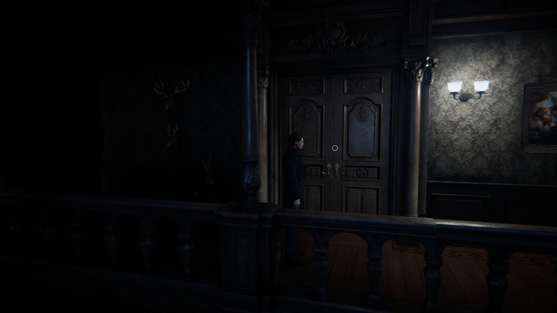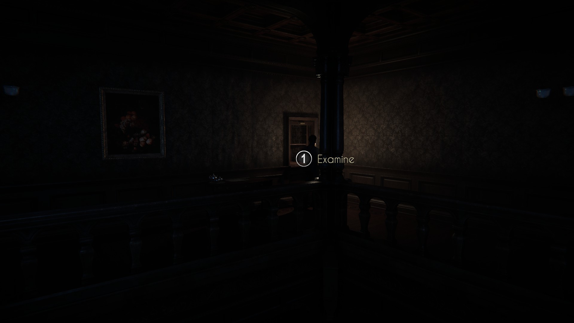 If you go straight from your bedroom door, you’ll encounter a dumb waiter. Make a note of it for later. From there, turn right and make your way around the landing. You’ll pass the upstairs entrance to the library and the stairs to the attic before reaching the next inlet, where you can examine one of the doors.