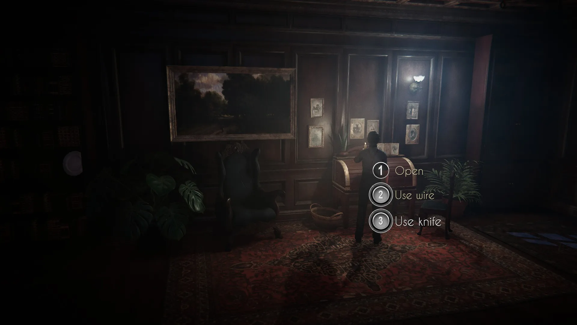 On the left side of the desk is a small chest. Open it and take the first pieces of a drawing. (You’ll be collecting these). Then select the “Light” option on the candle. Keep in mind this will only be available if you already have the matches.