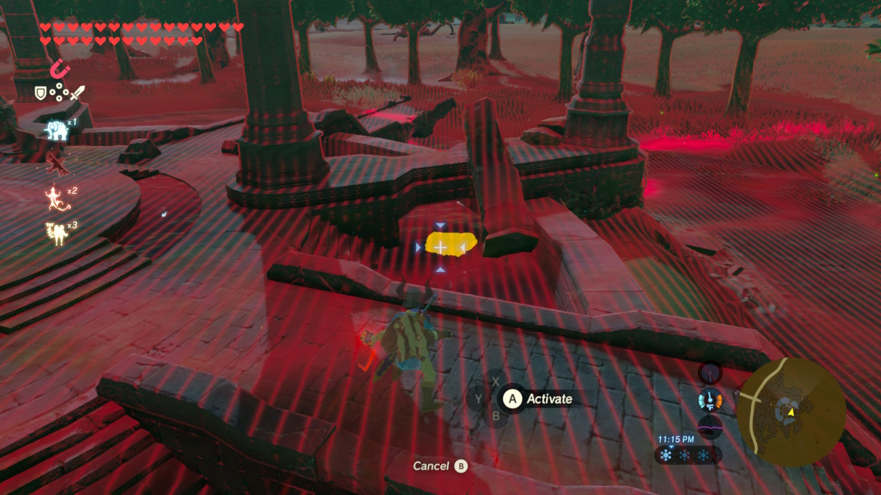 The chest is hidden in the northwest corner of the coliseum, three arcs to the left of the giant pile of debris. And it must be pulled out of the ground with Magnesis. Oh yeah, and there’s a Lynel here waiting to fight you after every Blood Moon, so watch out for that!