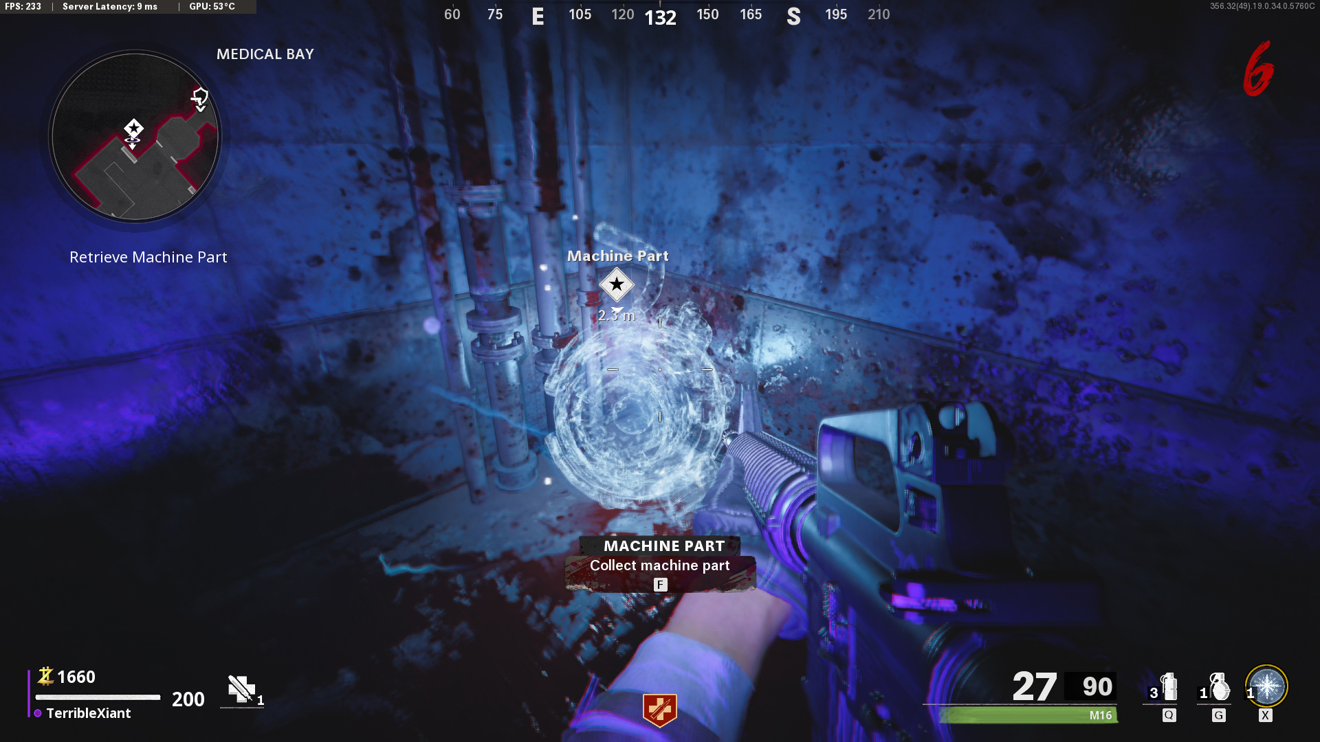 Reach the marked portal and activate it for 500 points. You’ll be transported to a room with a wire-mesh-looking machine part. Pick it up and take it back to the accelerator room, where the Pack-a-Punch machine awaits in a similar wire-mesh outline.
