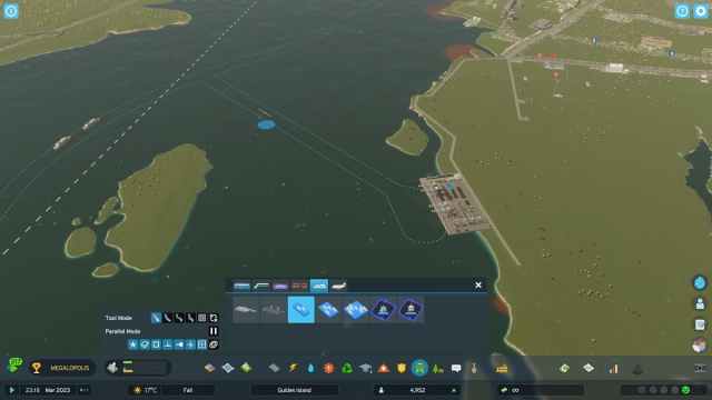 To get more access to these routes, you’ll need to purchase addition map tiles that include those routes. I have a screenshot below that shows part of the shipping route outside my city limits. However, I bought tiles that included part of that route so I could connect my own harbor to it.