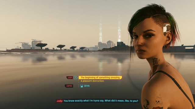 If you do spend the night with her, Judy will be out on the dock smoking come morning, and she’ll ask what that night meant to you. If you want to complete Judy’s romance, select “The beginning of something amazing.”