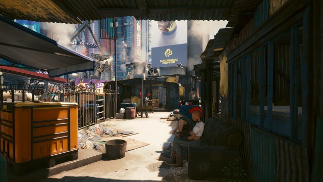 In particular, you’ll want to be in the shantytown on top of the buildings there. If you use the fast travel point as a starting location, look down on the metal shacks. You should see one with its doorway facing you almost directly. You should also see a red sign next to the left of the opening when you head into the shantytown.