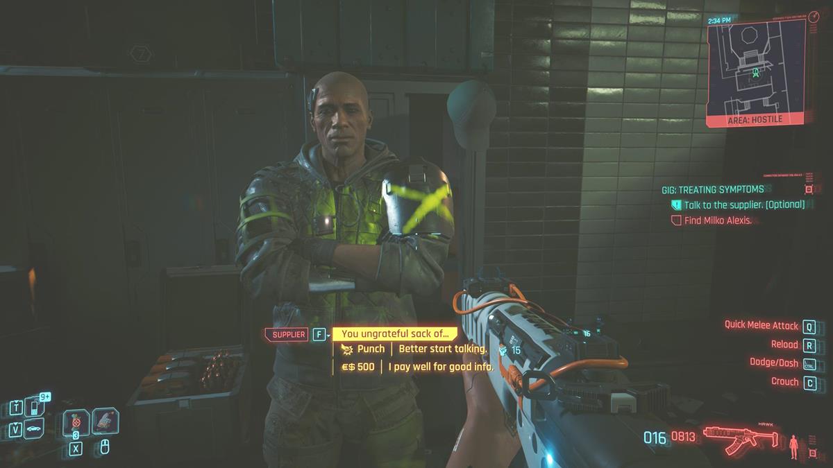 On the second floor, you’ll encounter a supplier who’s being threatened by one of the thugs. This is purely optional, but I suggest talking to him in any case. You can either pay him 500 credits to give you more info about Miko Alexis’ location, or you can punch him in the face.