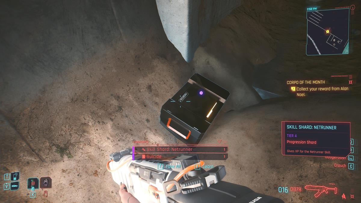 After making your decision, exit the facility via the sewers so Mr. Hands can learn of the job you did. In my case, I opted to let Alan finish his task. This was actually the ideal option since, much later in the game, he’ll contact you about his findings. This leads to a short quest called Corpo of the Month. If you return to the sewer exit, you’ll find his stash. I was able to pick up a Netrunner XP skill shard and a Suicide quickhack equipment from this container.