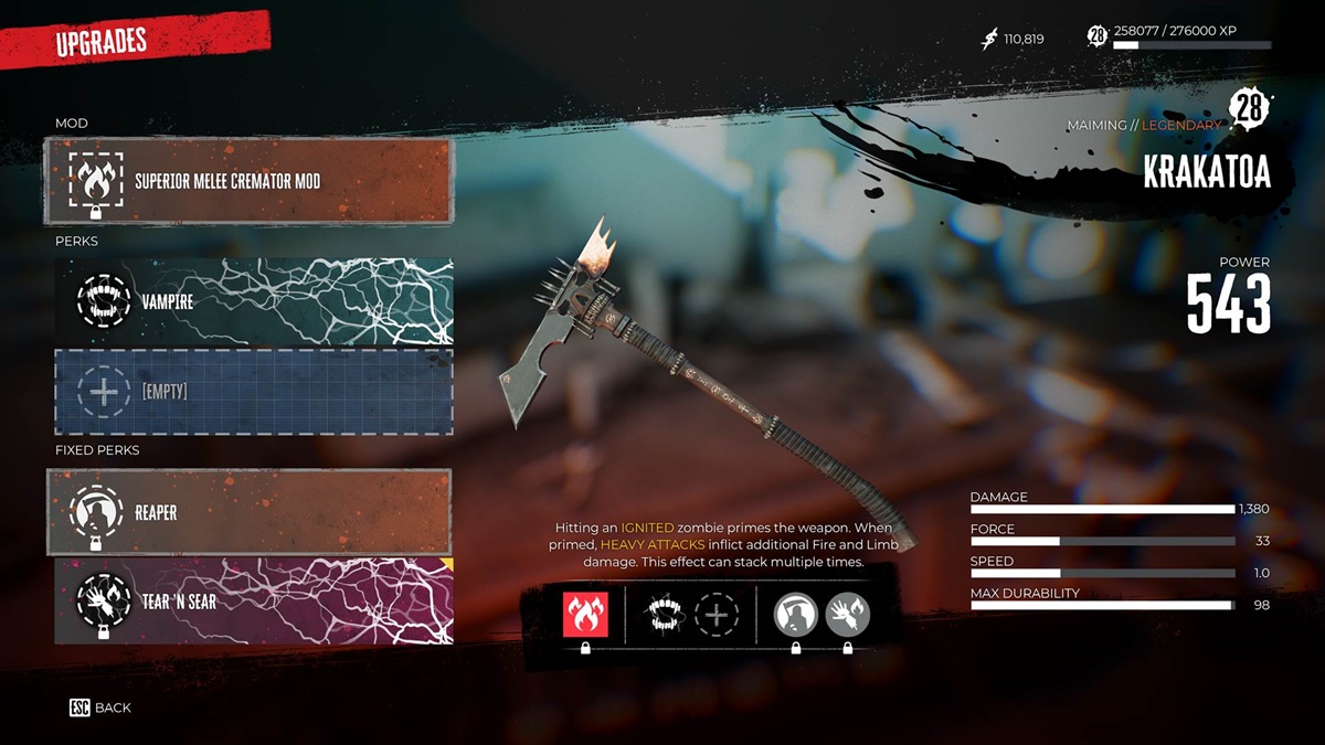 - Fixed Perk #1: Reaper: Hitting an ignited zombie primes the weapon; when primed, heavy attacks deal additional fire and limb damage (can stack multiple times).