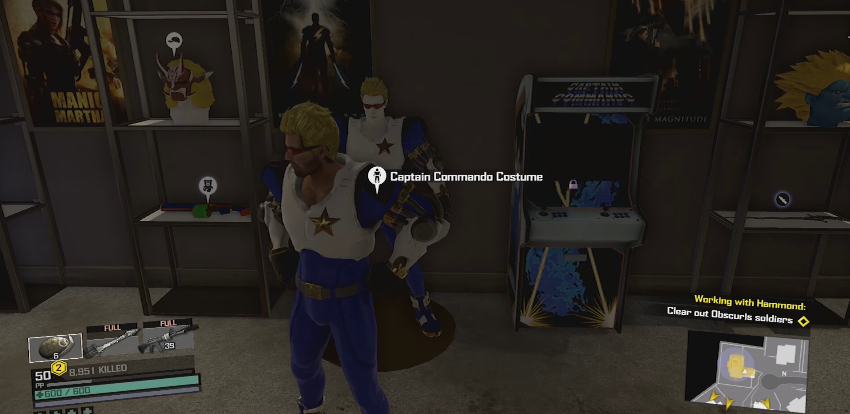 On the left side of the room is a treasure trove of Capcom memorabilia, including masks, weapons, and even an standing arcade. At the far left side of the collection is the Captain Commando costume ready for the taking.