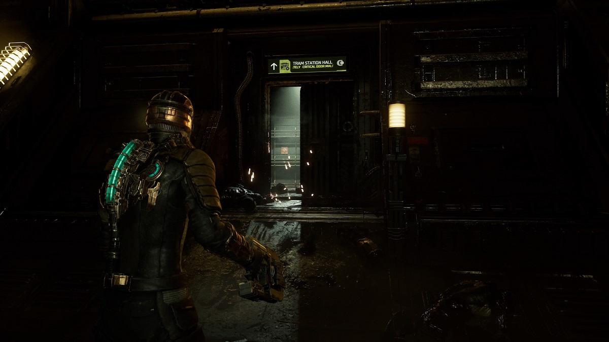 After getting the Plasma Cutter, go through the nearby doorway toward the Tram Control Room. Follow the path left, then through the door on the right. Interact with the control panel next to the fan inside the door, underneath the red Security Phone sign.