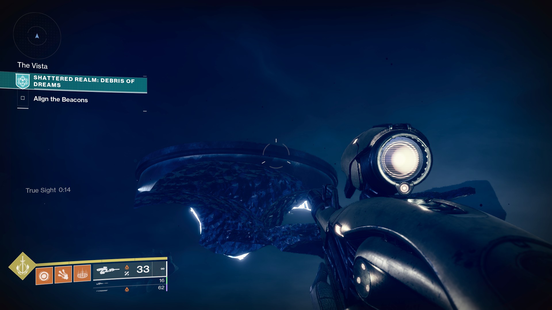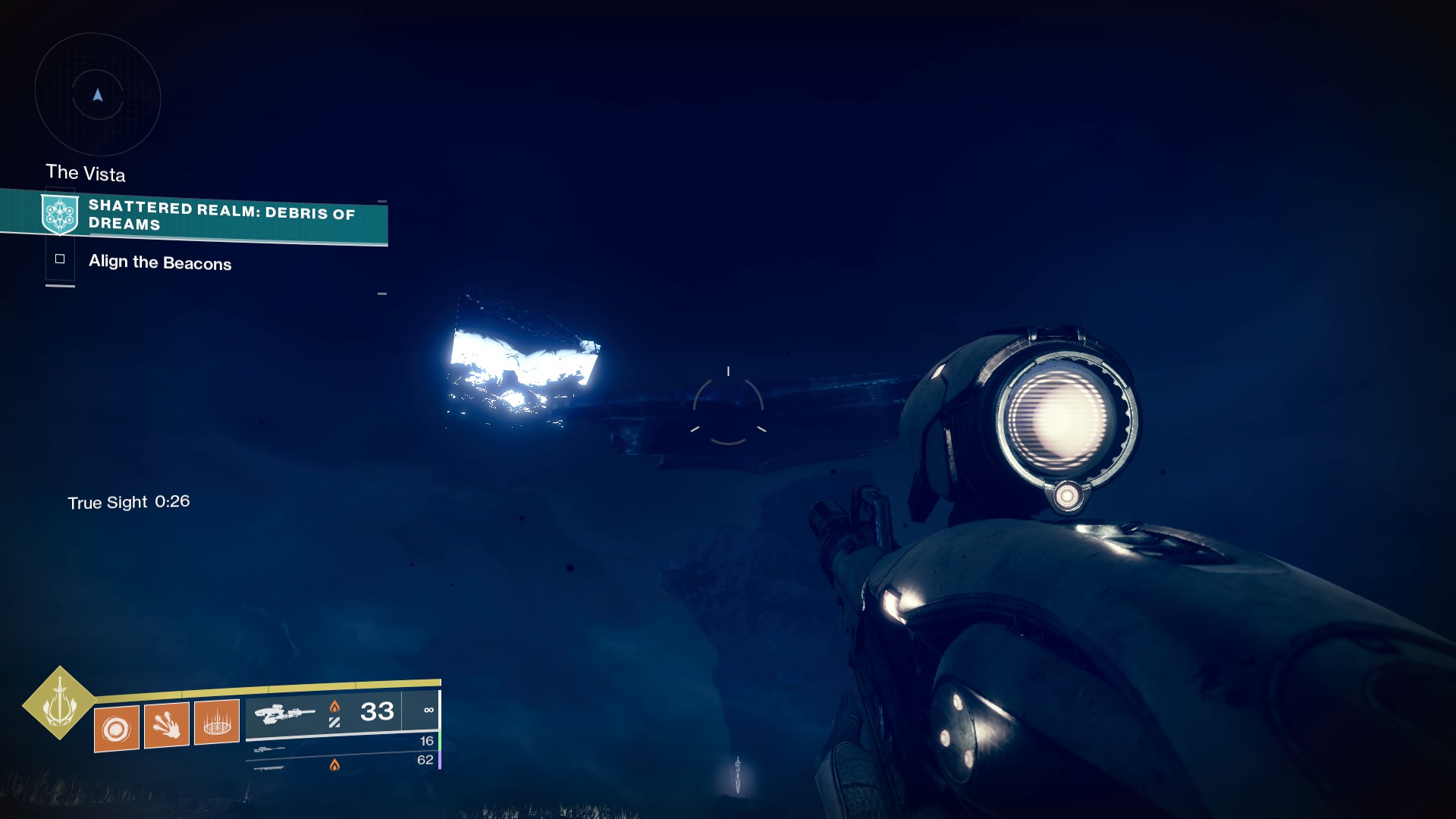 Return to the True Sight pillar outside the beacon area, activate it and follow platforms down and to the left. The chest sits on a floating platform.