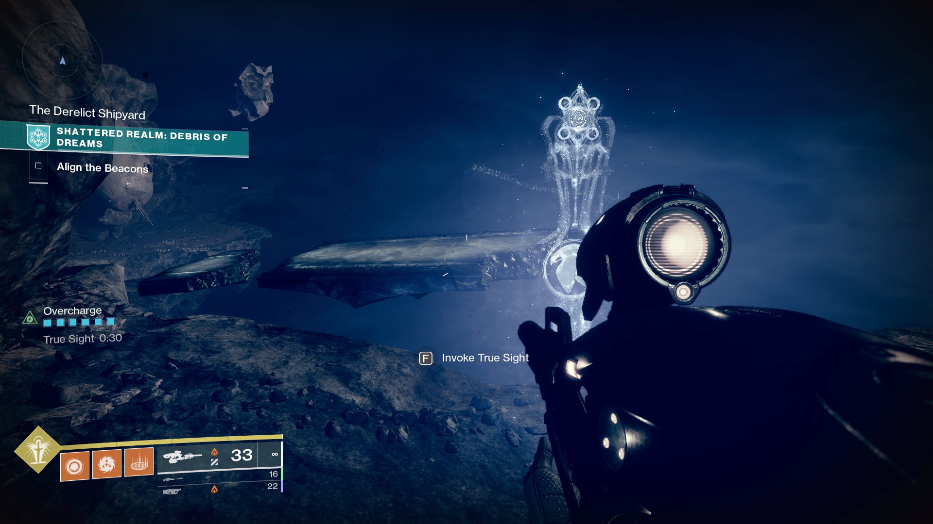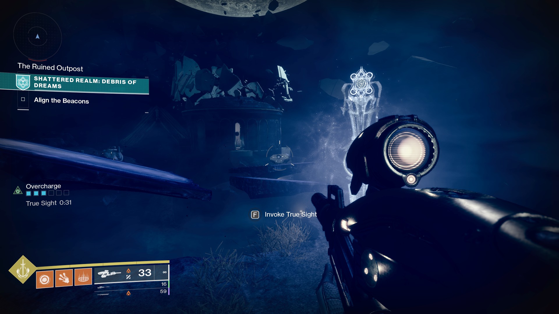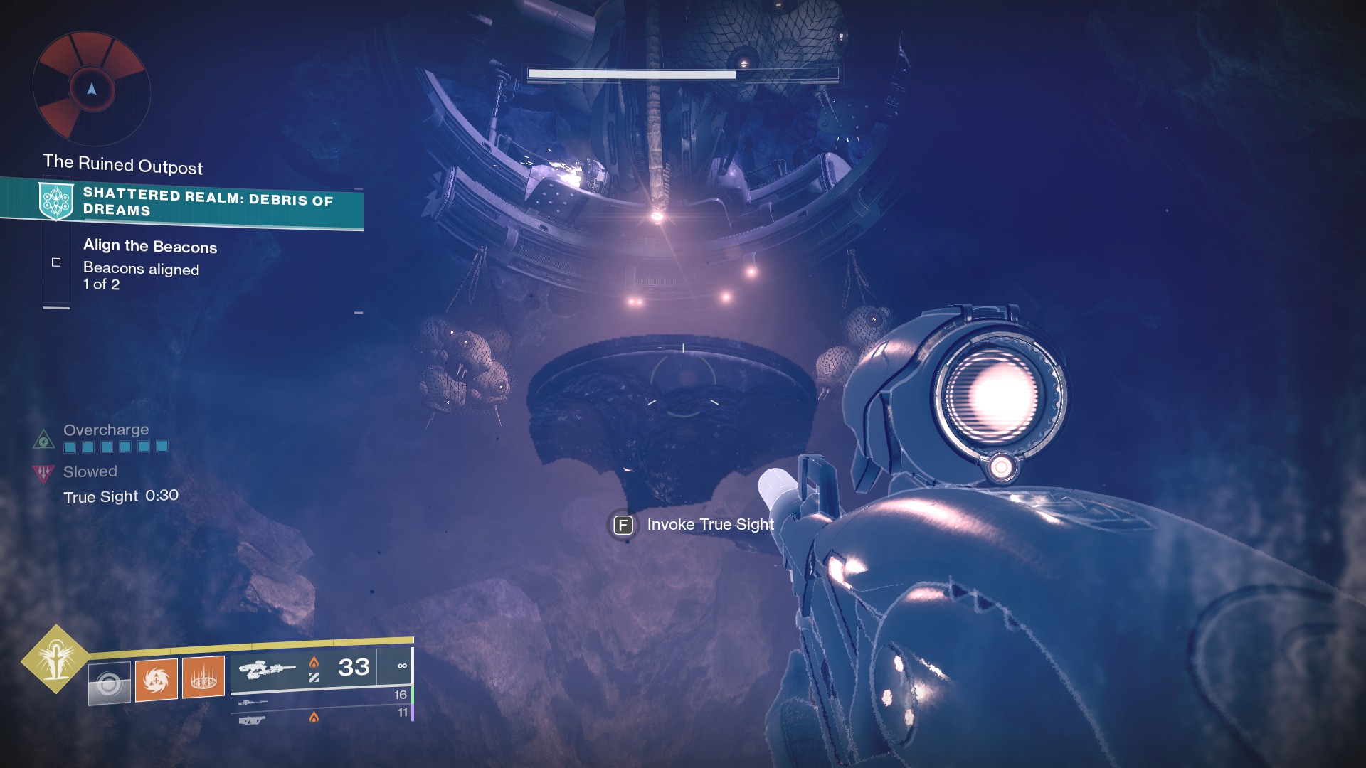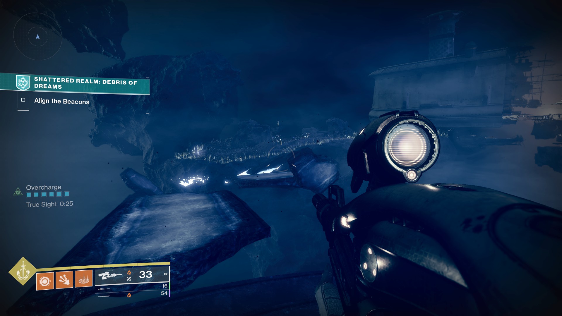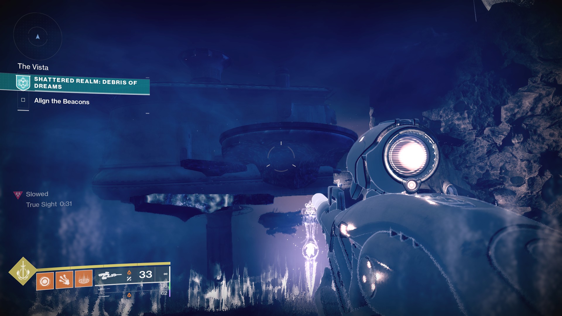 From the hut, you’ll see a True Sight pillar on a jet of rock. Ignore it for now, and instead go to the True Sight pillar on the path toward the first beacon room.
