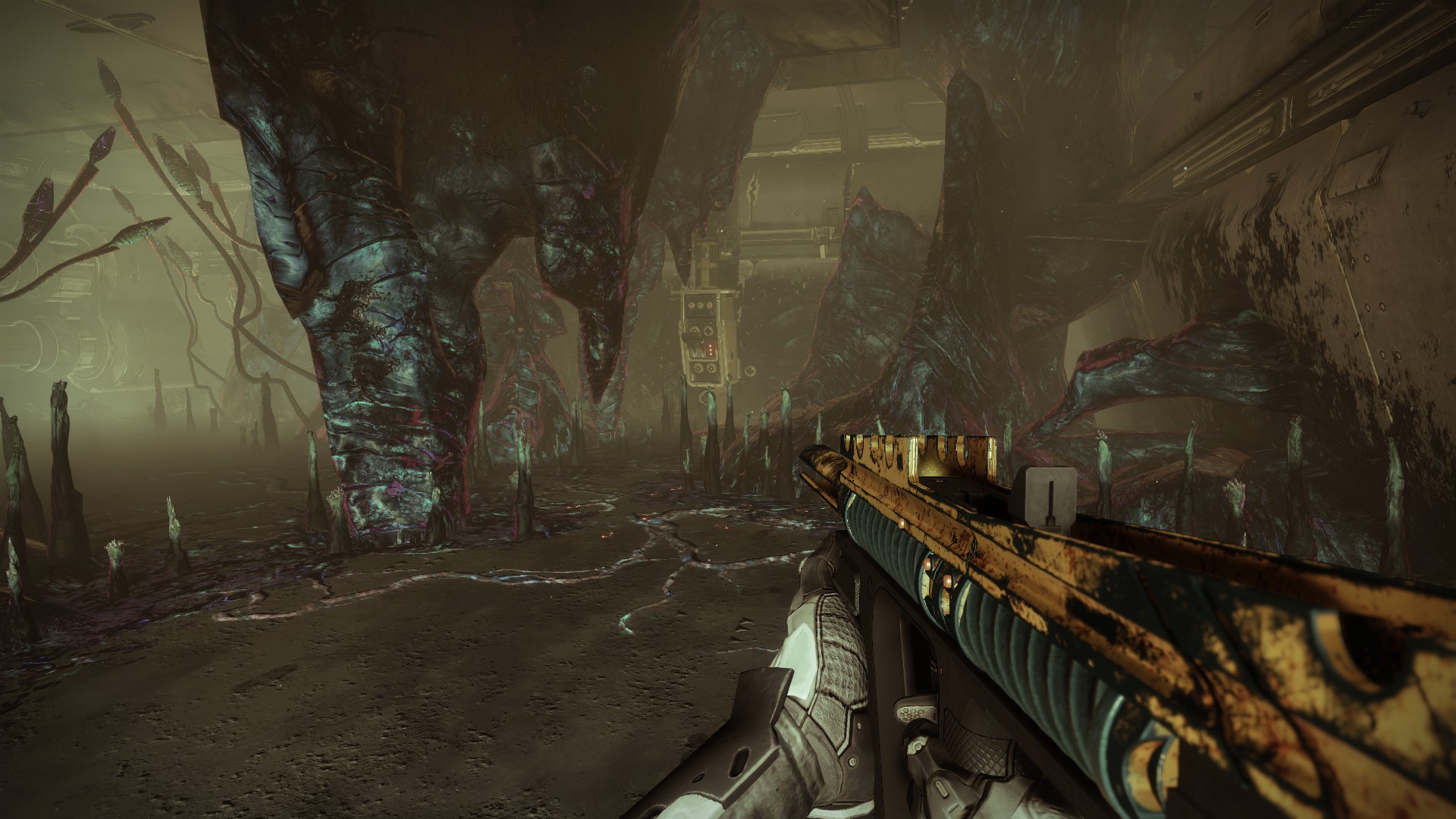 Past this door, you’ll find yourself back in the lab with the Scorn corpse. Go through the now open door to your left and through the Darkness mist.