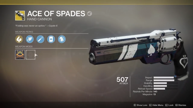 The Hunter-exclusive exotic hand cannon, Ace of Spades, has returned to Destiny 2 in the new expansion — Forsaken. This powerful weapon has 13 bullets in magazine and allows you to clear an entire room of enemies with precision kill bonuses.