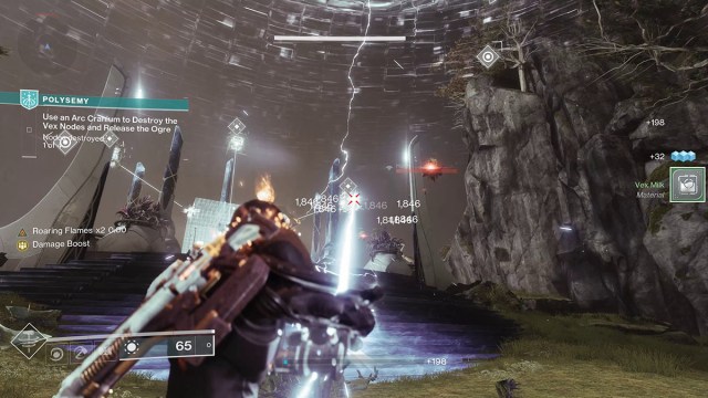 The boss fight for the Polysemy mission is an iteration of the previous encounter. The boss, a huge Vex Hydra, is protected by an immunity shield. Defeating the Arc-Charged Minotaurs once again makes them drop Arc Craniums, which you can use to deplete the boss’s shield.