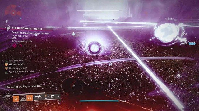 After completing the first phase of the Blind Well, the shield around the central pillar will drop, and one of the egg-shaped devices on the outskirts of the arena will instead gain a shield. You and your fellow Guardians must go there lest you succumb to the mist. Shortly after the new shield goes up, enemies will begin to spawn, and the process of defeating them for progress repeats.