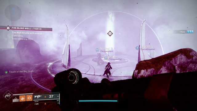 The first phase of Blind Well is the tutorial for the remaining ones, minus the boss wave. A shield will appear around the central pillar in the pit. Standing inside it will grant you the Touch of the Sky buff, protecting you from the acrid mist that’s now filled the rest of the room.
