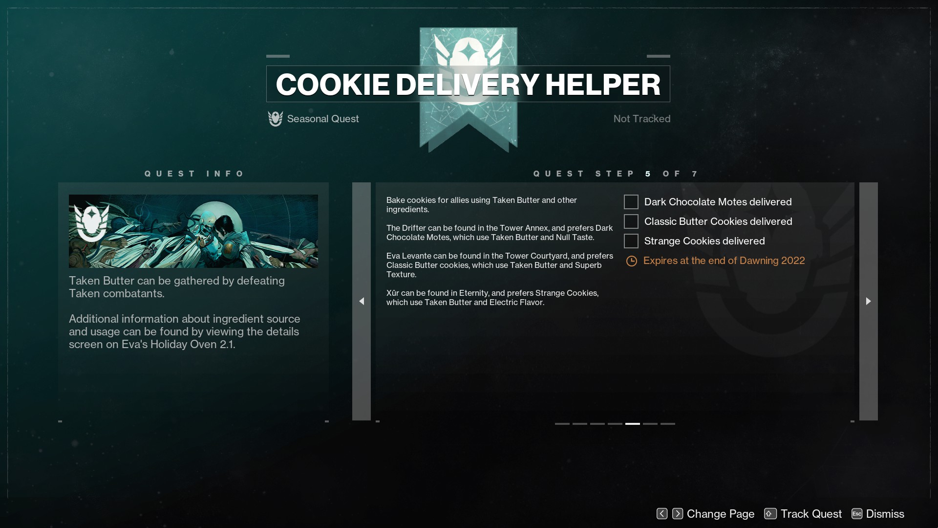 Be aware that if you managed to Masterwork Eva’s Holiday Oven before completing Cookie Delivery Helper, the quest will vanish once you complete step 6, as step 7 is redundant. You will receive no message or notification, but the interaction is intended, per Bungie Help’s official Twitter account.