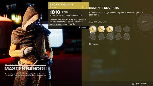 The last and least reliable way of getting the Celestial Nighthawk is to simply take any Exotic Engrams you collect to Master Rahool and decrypt them for random rewards. You might get an armor piece, you might get a weapon, but if you have Engrams to spare, it’s definitely a method.