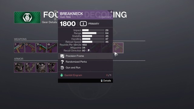 - Focused Decoding at The Drifter: The most consistent way to get the Breakneck is to focus your Gambit Engrams at The Drifter. It only costs one engram per Breakneck, and you get plenty of them by simply playing Gambit matches. You do, of course, need to actually play Gambit, which is not a fate I wish on anyone. But if you enjoy it, go all in. I should also mention that you don’t need to win your matches to get Gambit Engrams. Just complete them. Don’t take that as an invitation to sandbag or AFK, but getting stomped won’t hurt your chances.