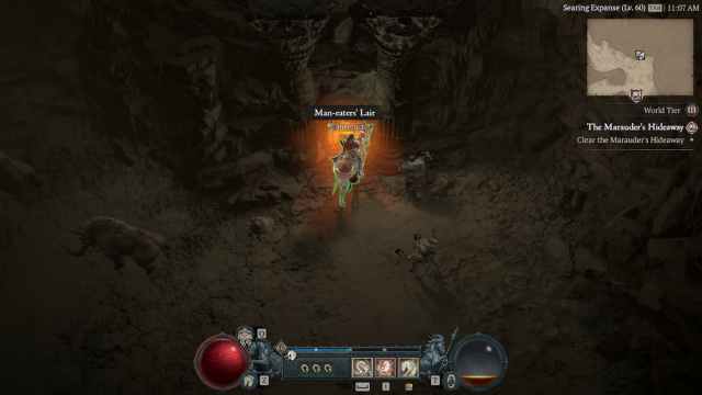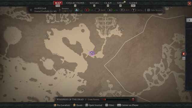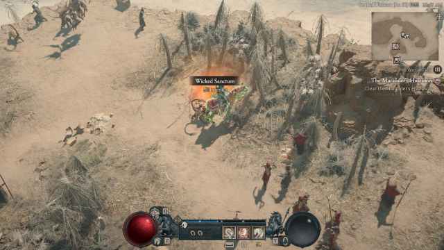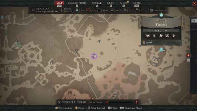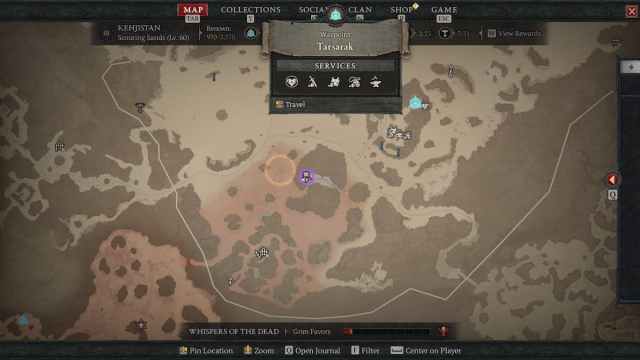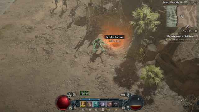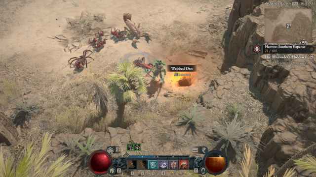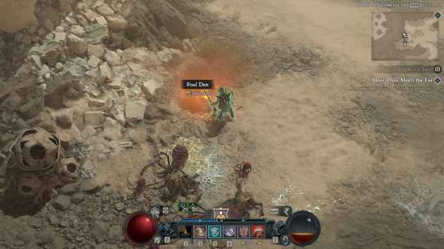 The Foul Den can be found closest to the Untamed Scarps of the Dry Steppes. Head toward the Seared Basin World Boss area from Tarsarak. When you get to the entrance, go northwest; don’t take the path up toward the Dry Steppes. Alternatively, you can portal to Jirandi and go south, then head west when you reach the Scouring Sands. If you come across the Sirocco Caverns dungeon, head south more.