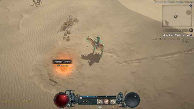 The Forlorn Cavern is located in the middle of nowhere in the Scouring Sands. The only things close to it are some discarded travel items and an Altar of Lilith in the distance to the west. It’s a quick gallop west from Tarsarak, however.