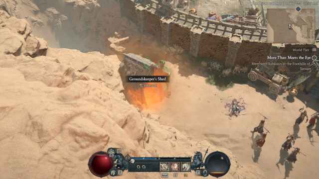 The Groundskeeper’s Shed can be found just outside the ruins of Elias’ temple hideout. No longer surrounded by a raging dust storm, you can find it by heading northeast from Tarsarak. This cellar is located in the sandy entrance area on the left side.