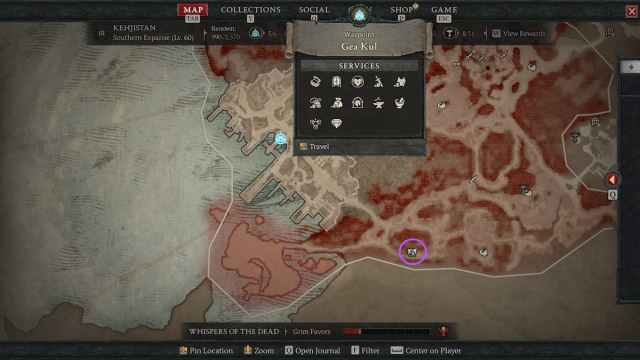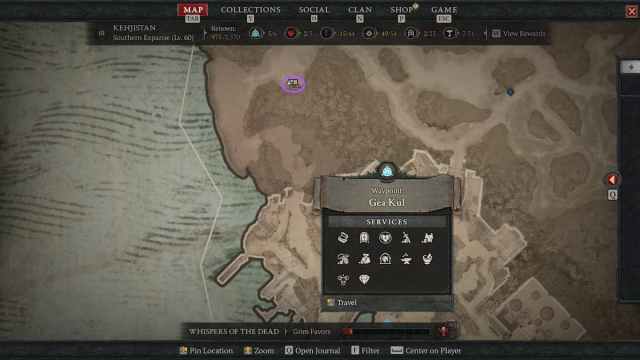 Heading toward the water, you’ll find the Festering Burrow. Located right outside the western portion of the Dilapidated Aqueducts, you can portal to Gea Kul and head northeast to find it.