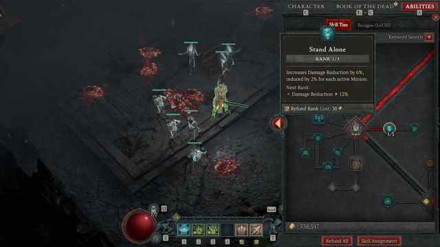 As a Necromancer, you have the ability to raise minions from corpses. After completing your class quest, Call of the Underworld, you’ll be able to summon a Golem, as well as melee and Mage Skeletons. With Bone Spear, if you have the room, you can keep your melee Skeletons or sacrifice them. If you keep them, make sure they’re Reaper Skeletons.