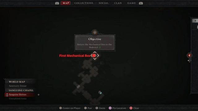 - Once you enter the Sanguine Chapel dungeon you’ll need to return two Mechanical Boxes to the Pedestals at the interior doors to proceed.