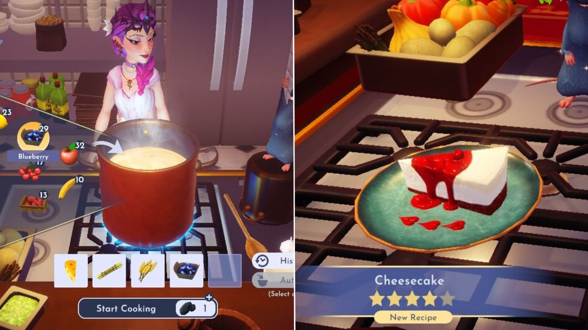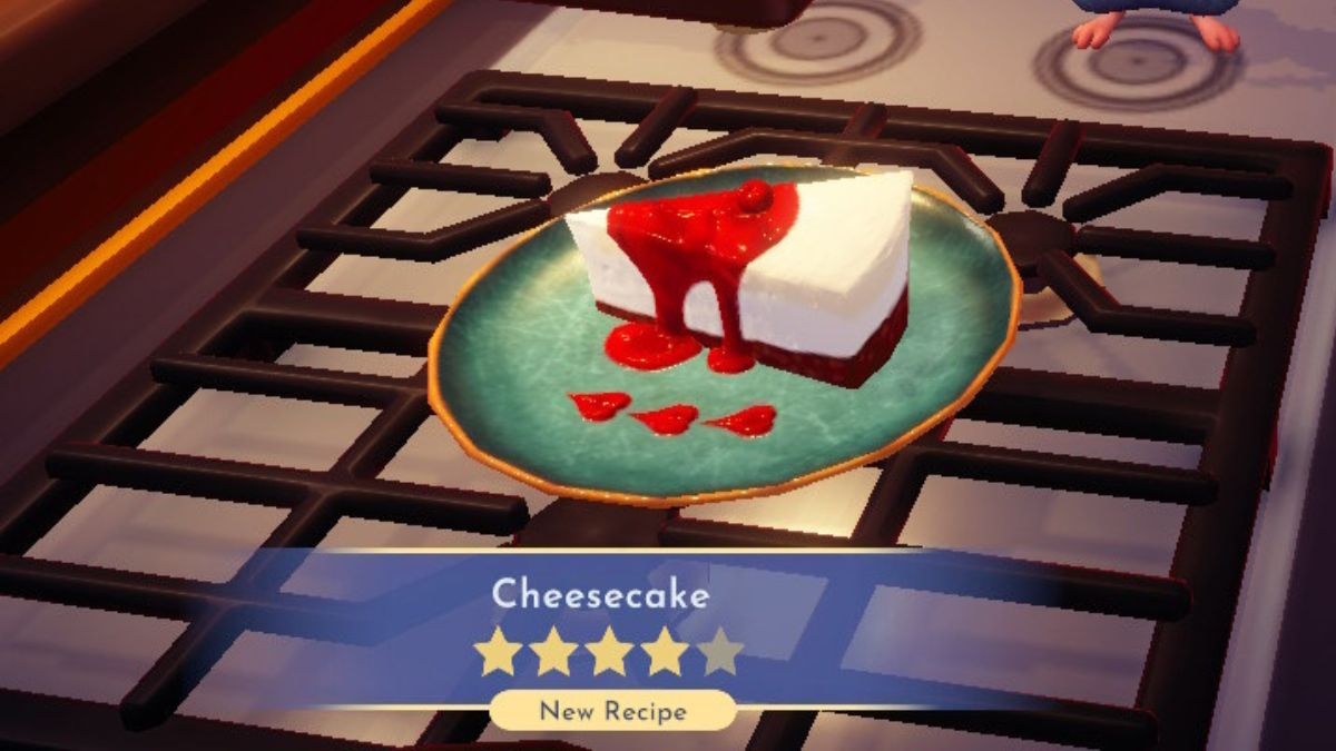 The five-star Cheesecake recipe requires you to unlock the Dazzle Beach biome (1,000 Dreamlight), and Remy’s restaurant Chez Remy (3,000 Dreamlight & 2,000 Star Coins).