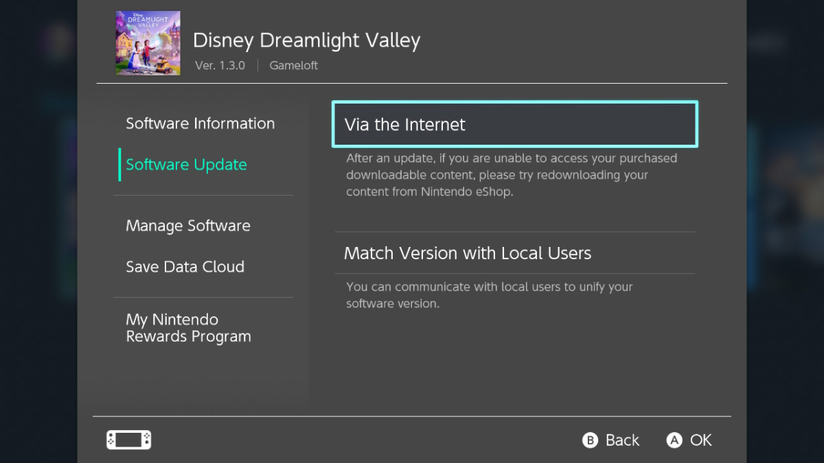 You will select Via the Internet and your device will scan for available updates. If you’re in need of an update, the update will begin after the scan. Once the allotted timeframe has passed, Dreamlight Valley is updated and ready to play.