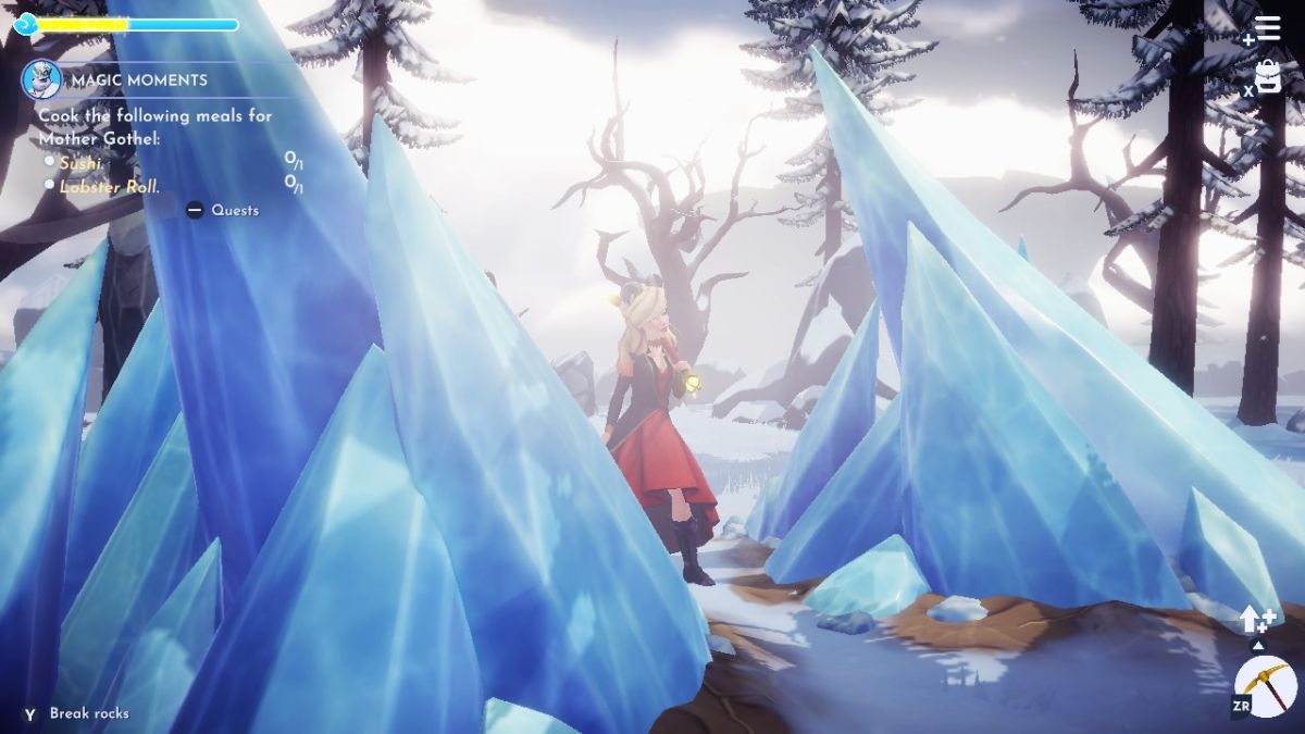Craft the potion and give it to Elsa, she will upgrade your pickaxe. You are now able to clear the large Ice Shards blocking the bridge in the Frosted Heights.