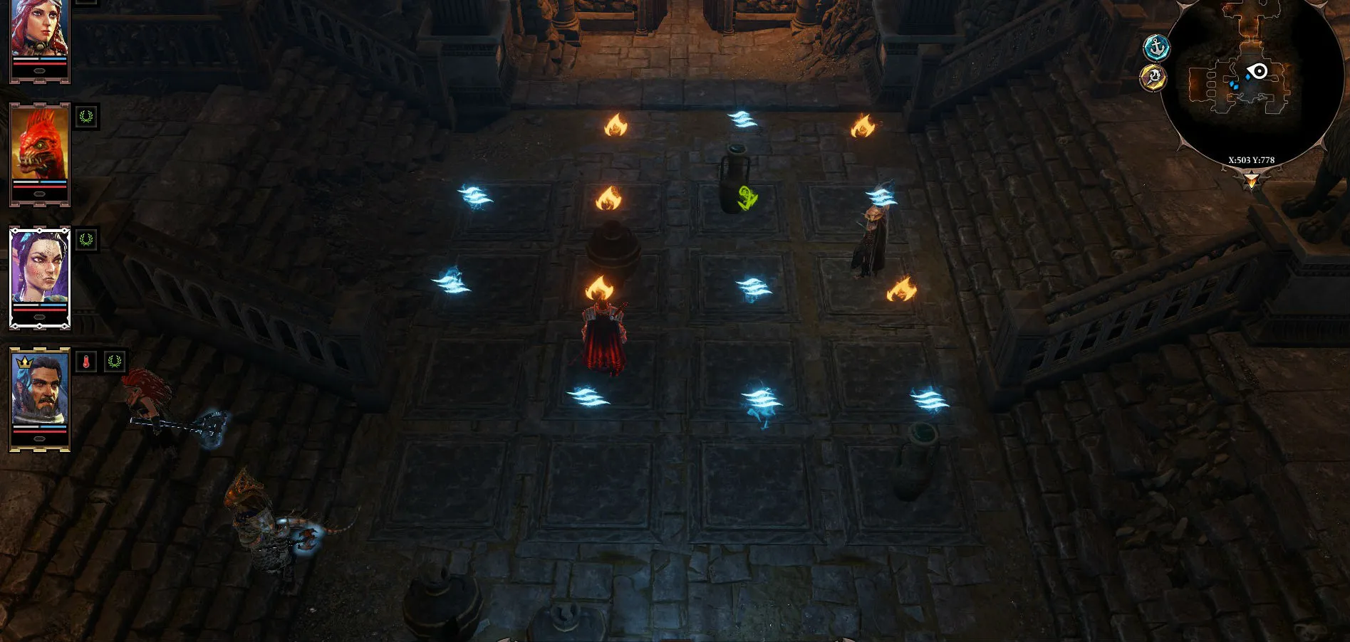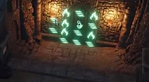 So how do you reach the correct mix of water, fire, and poison markers? The correct pattern (in the 4 X 4 pressure plate grid from left to right) is to place your characters or heavy objects on the spot marked “1” like this: