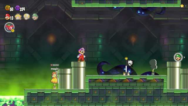 Online multiplayer in Super Mario Wonder allows you to see other players on the world map and in courses. In a Mario Kart meets Elden Ring fashion, these are live player shadows that look somewhat transparent. You can see them jumping over the same pools of lava, sinking into pipes, gathering power-ups, and more. It’s like they’re right there with you.