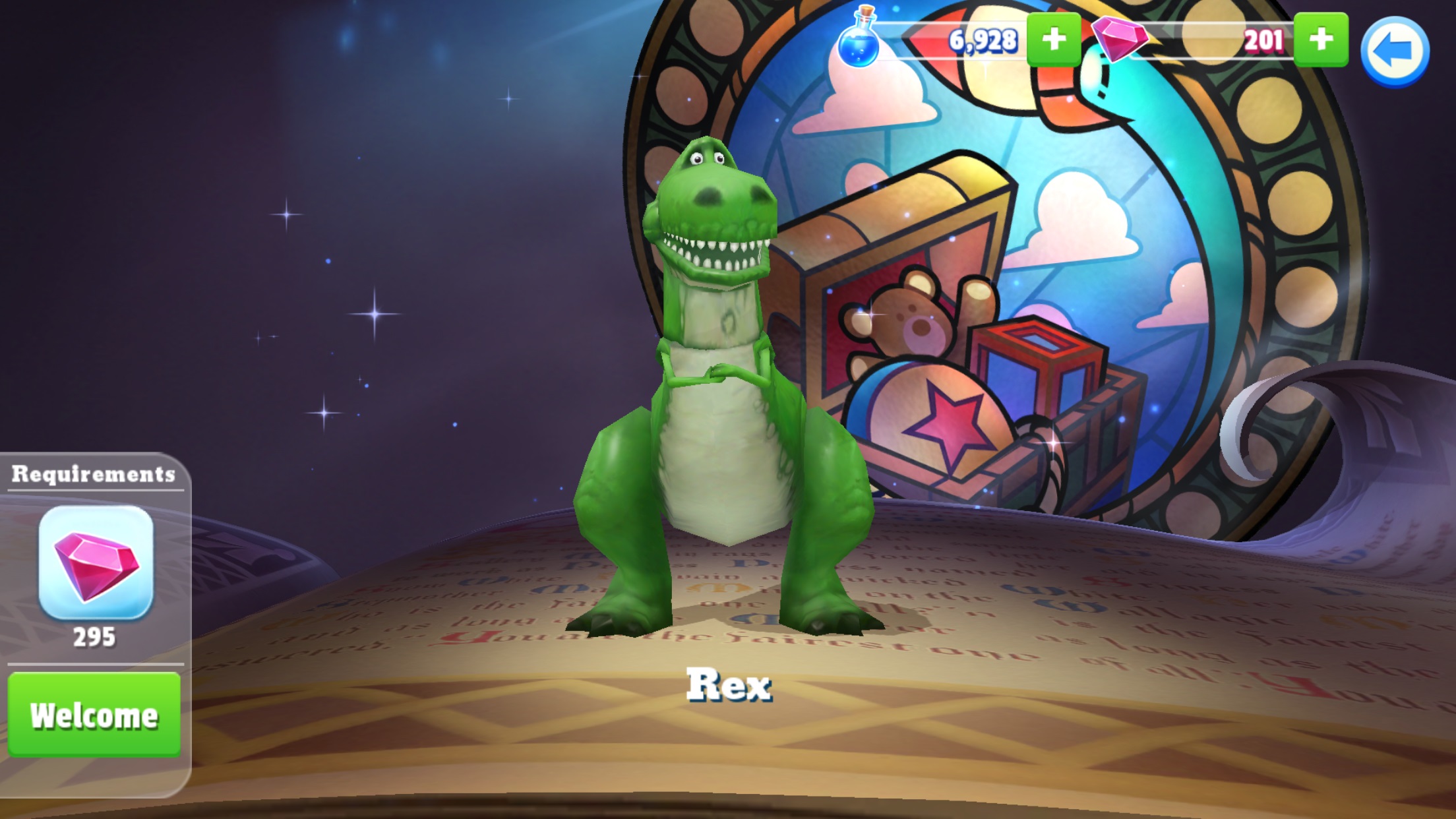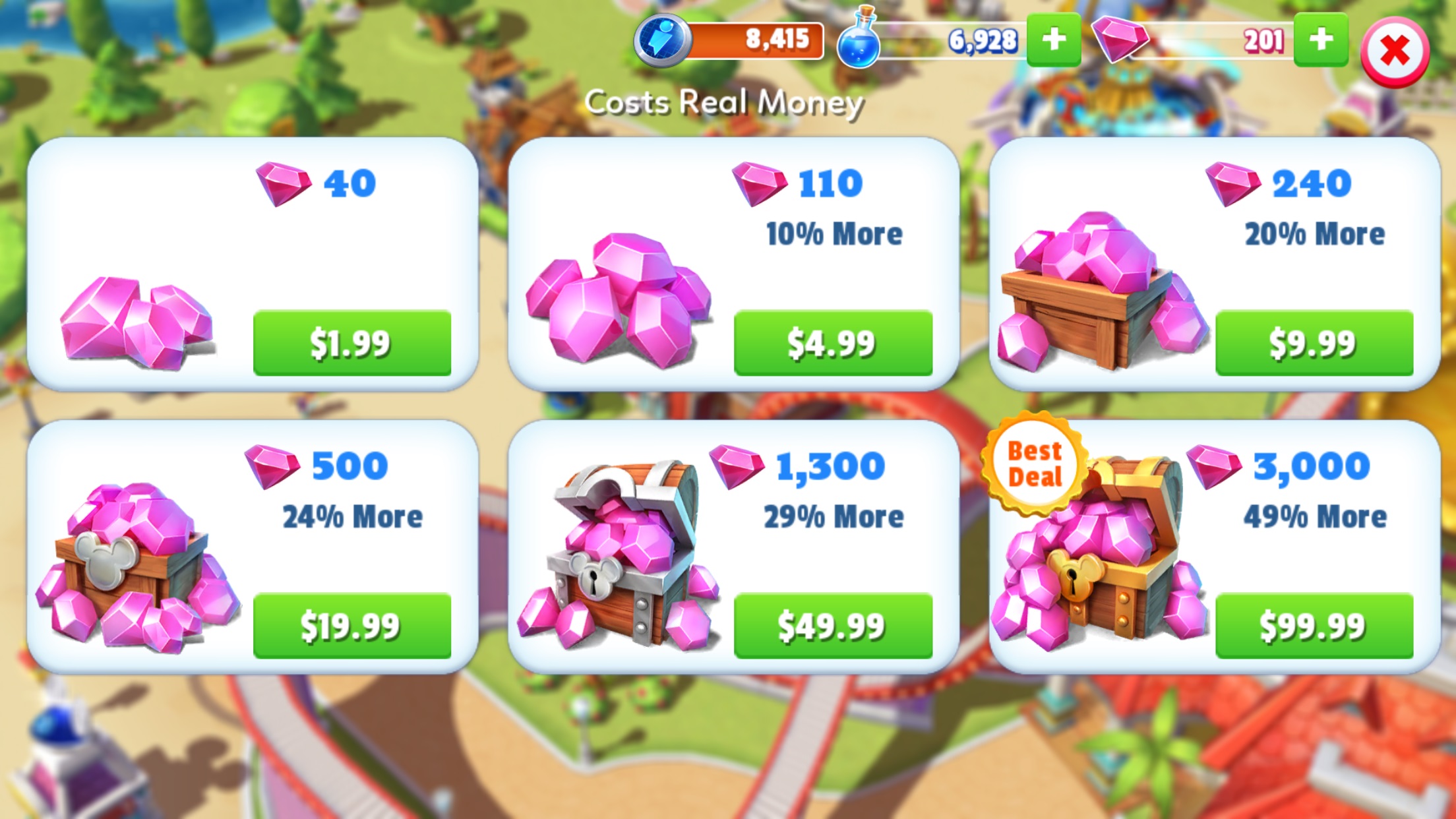 This is a free game to buy. There are microtransactions available that will allow you to purchase purple diamonds. But if you manage things right, you don’t need to buy more purple diamonds to advance the story. I haven’t put a dollar in this game, and my park is expanding just fine. But if you really want those extra purple diamonds to purchase Rex or Boo, you are more than able to.