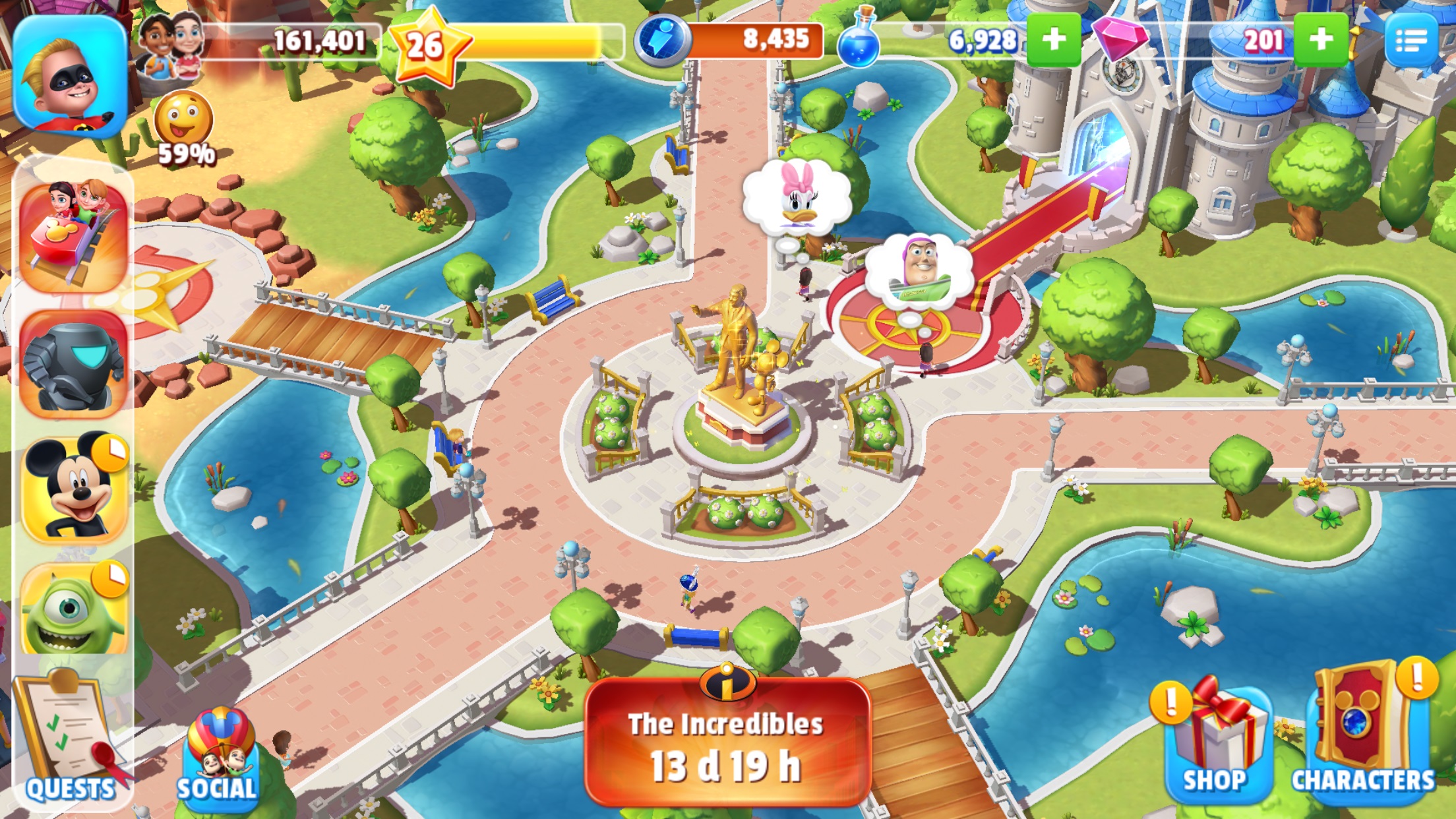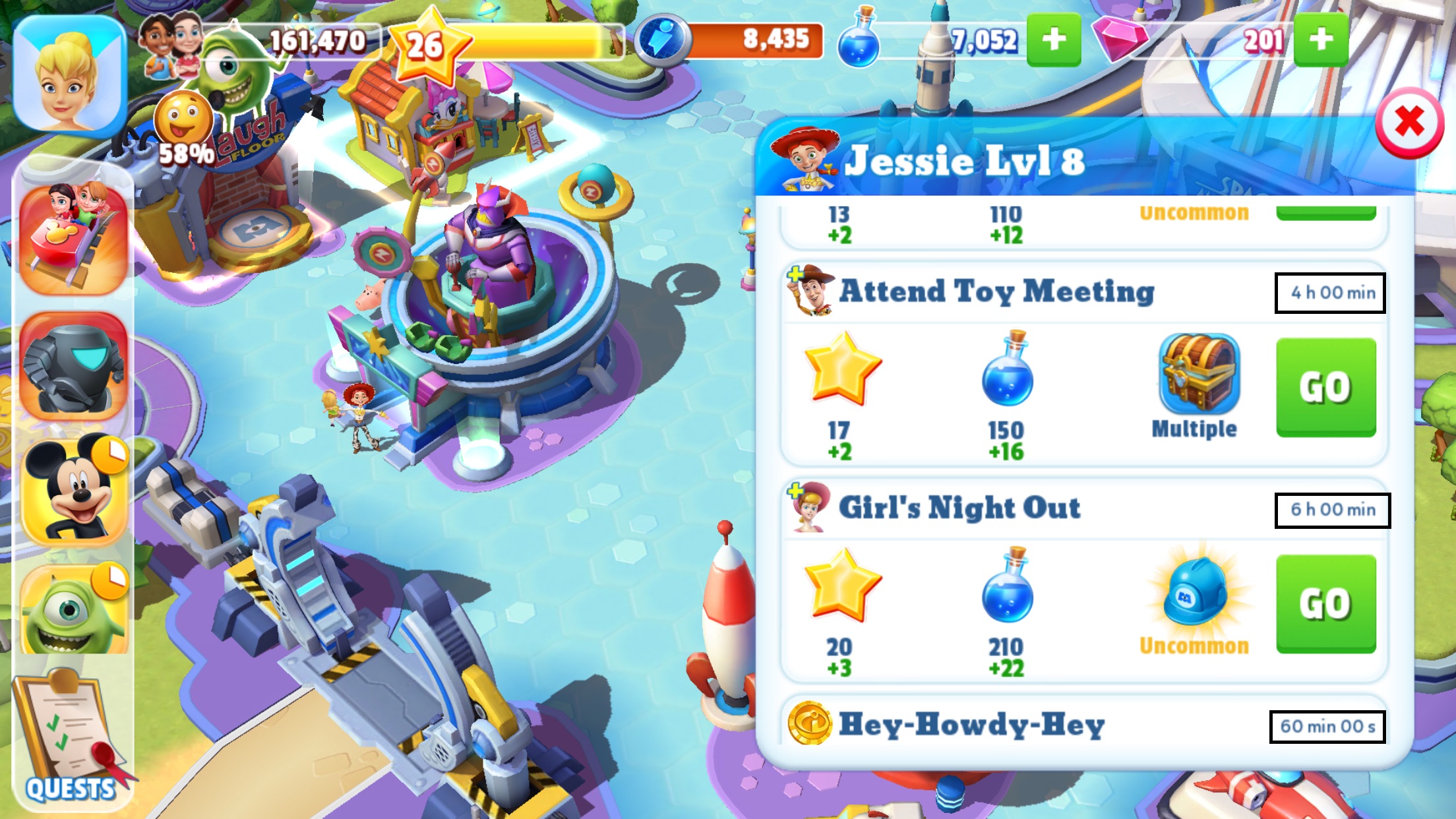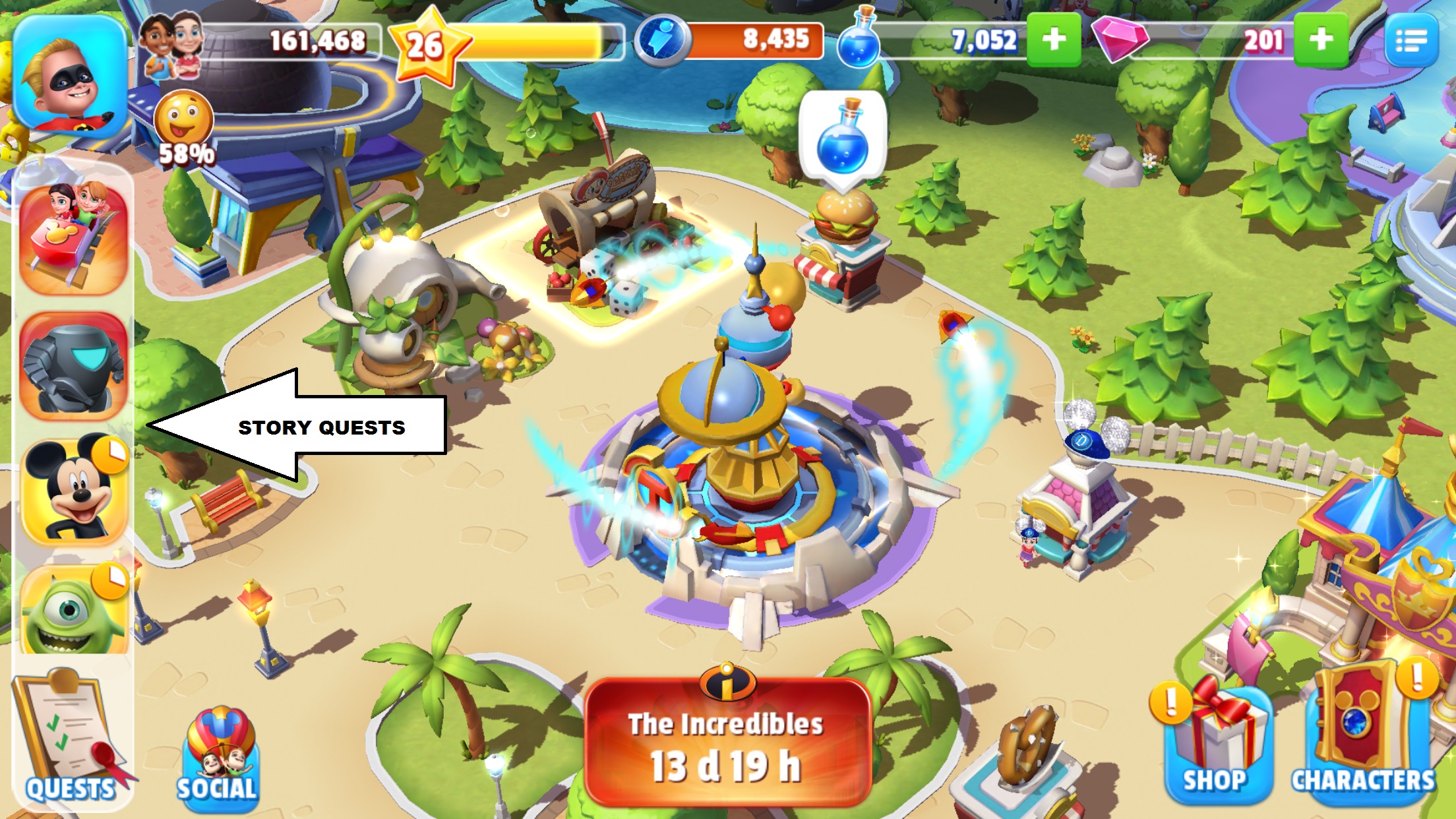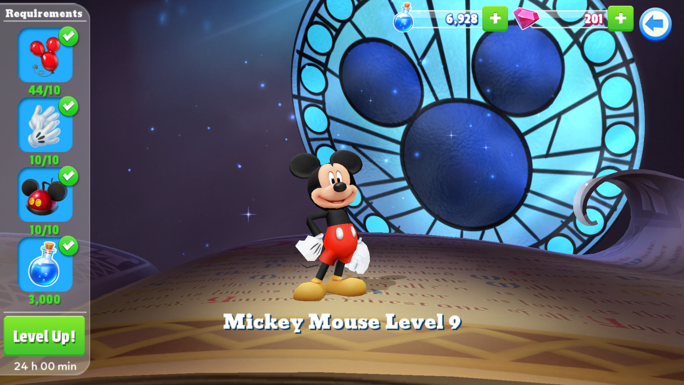 For example, Mickey Mouse has to be a level 9 to receive the quest to find out where Minnie is. If you want to unlock Minnie, you have to level up Mickey so he can complete that quest.