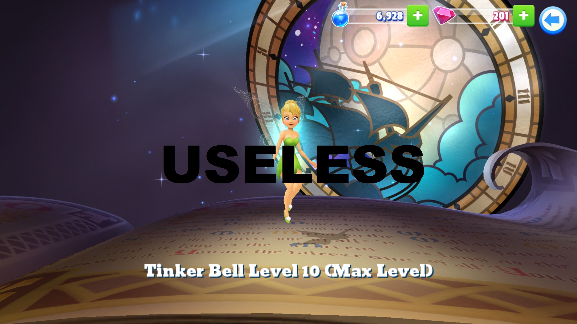 (Quick Tip: The only exception to this is Tinkerbell, because she’s useless. She is forced upon you but doesn’t have a main storyline. There is no reason to level her up because she has no effect on expanding your park at all.)