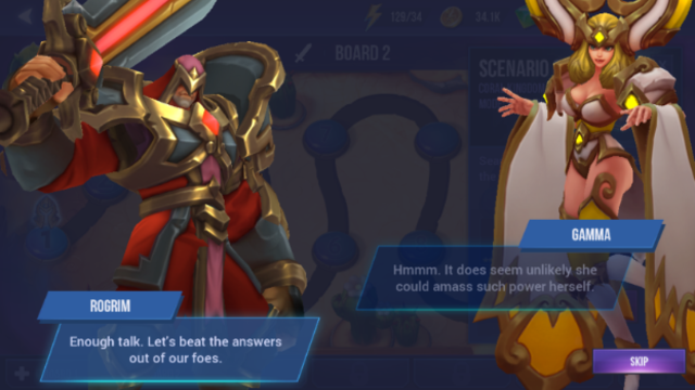 There are two main types of gameplay in Dungeon Hunter Champions — Adventure (PVE) and Battlefields (PVP). Adventure (PVE) has a story that progresses as you move through all 7 boards (or worlds) and defeat bosses — each board has 11 scenarios, some of which are just treasure chests, and a final boss. Each new scenario also contains a chunk of the story told through champion and villain discussions (as well as consistent fourth wall breaking). Though the conversation interludes can be pretty entertaining, you do have the option to skip them and the storyline completely if you’re just looking to get to the action.