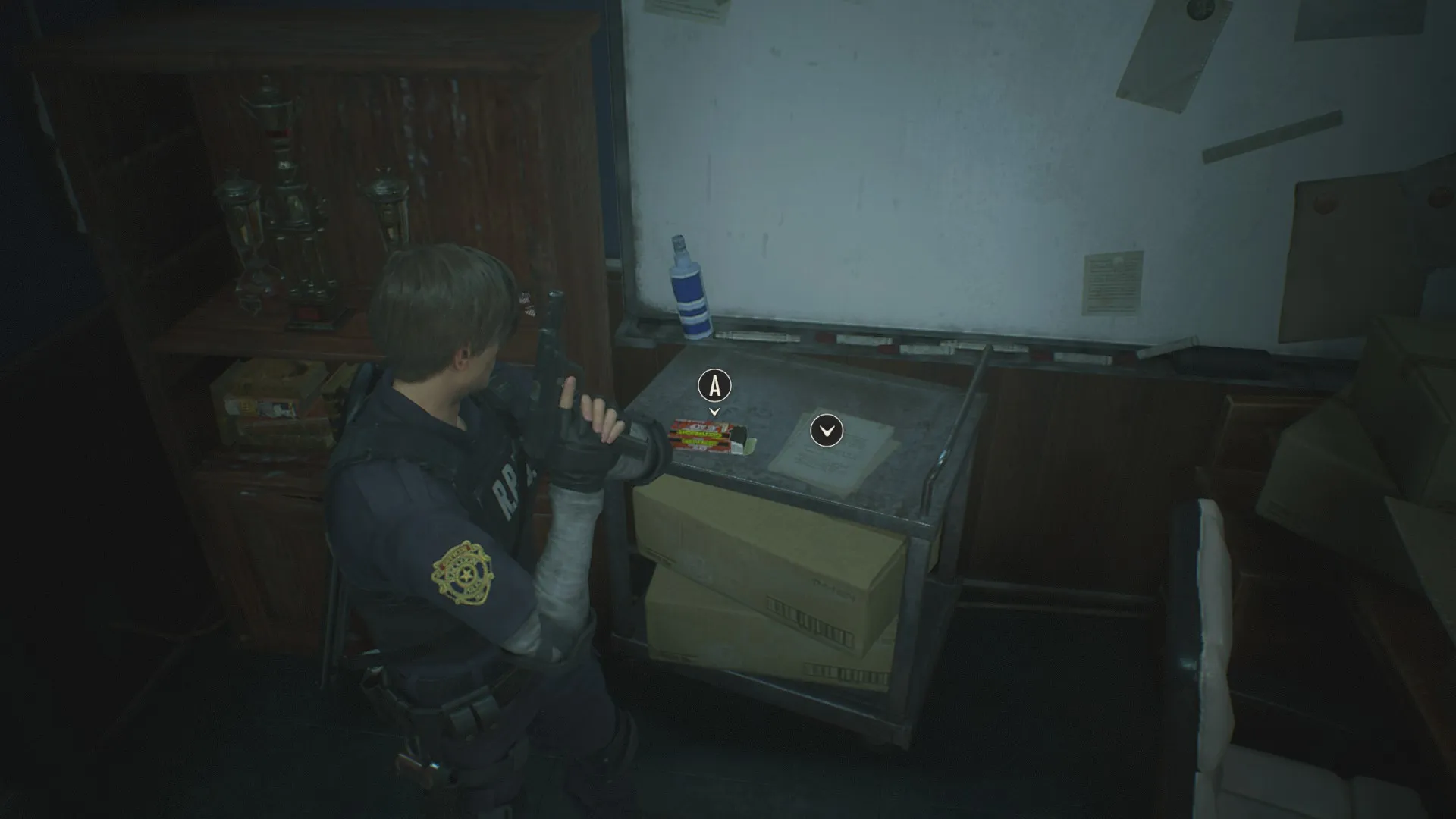 Next to a jar of Gunpowder on a table in the RPD’s West Office. (As with Claire, this is technically a different file in the same place with the same name, which is counted separately for the purposes of the achievement.)
