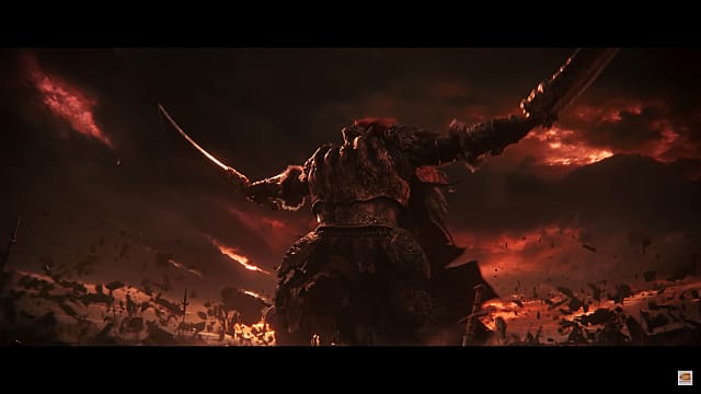 Starscourge Radahn will ride away on his horse and spread his arms wide, making a large circle before turning back toward you and slashing three times as he rides around your position. The three hits are a true combo, which means if you’re hit by one, you’ll be hit by them all, and this attack does enough damage to kill almost anything in one series, so avoid it by dodging toward and to the right of each successive swing.