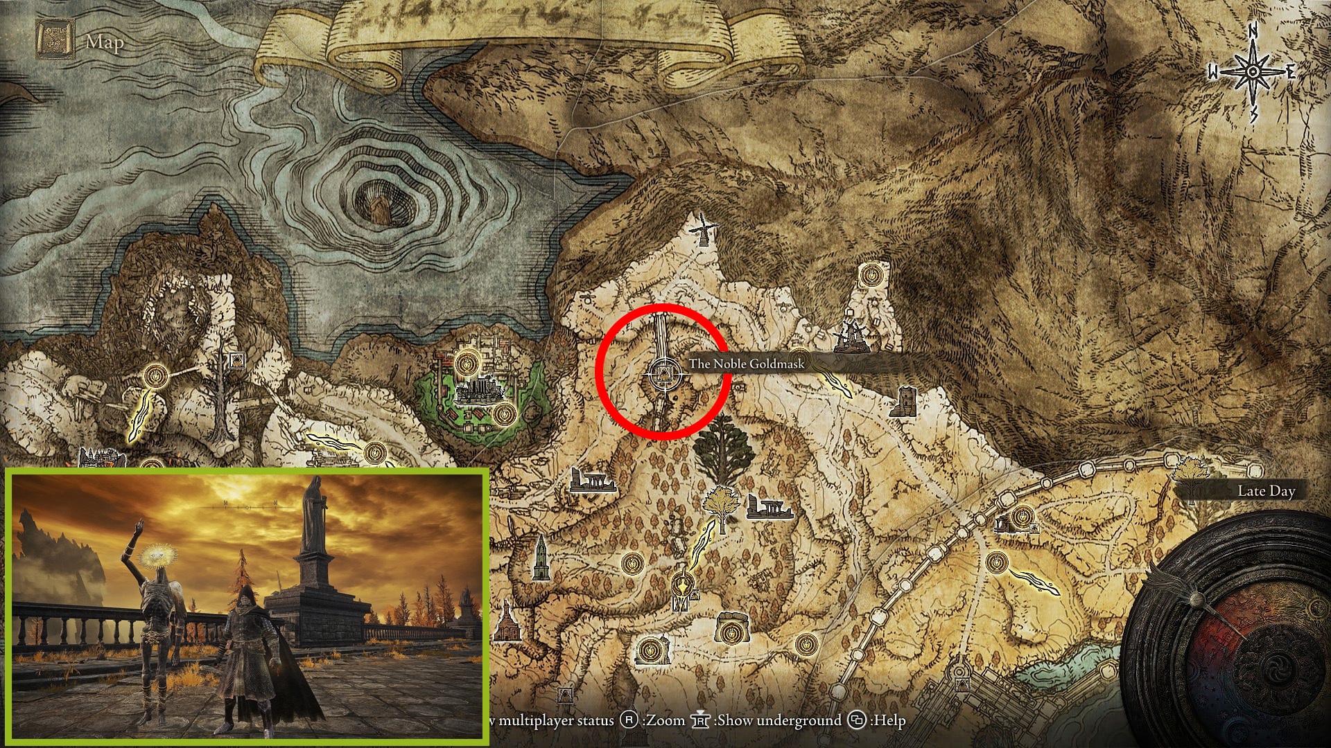 Up the road, north and east from the Altus Plateau map fragment, is a wandering patrol of nobles and Leyndell soldiers. Continue east past them, and you’ll encounter Brother Corhyn again, despondent. He’ll say he hasn’t been able to find Goldmask despite all his efforts.