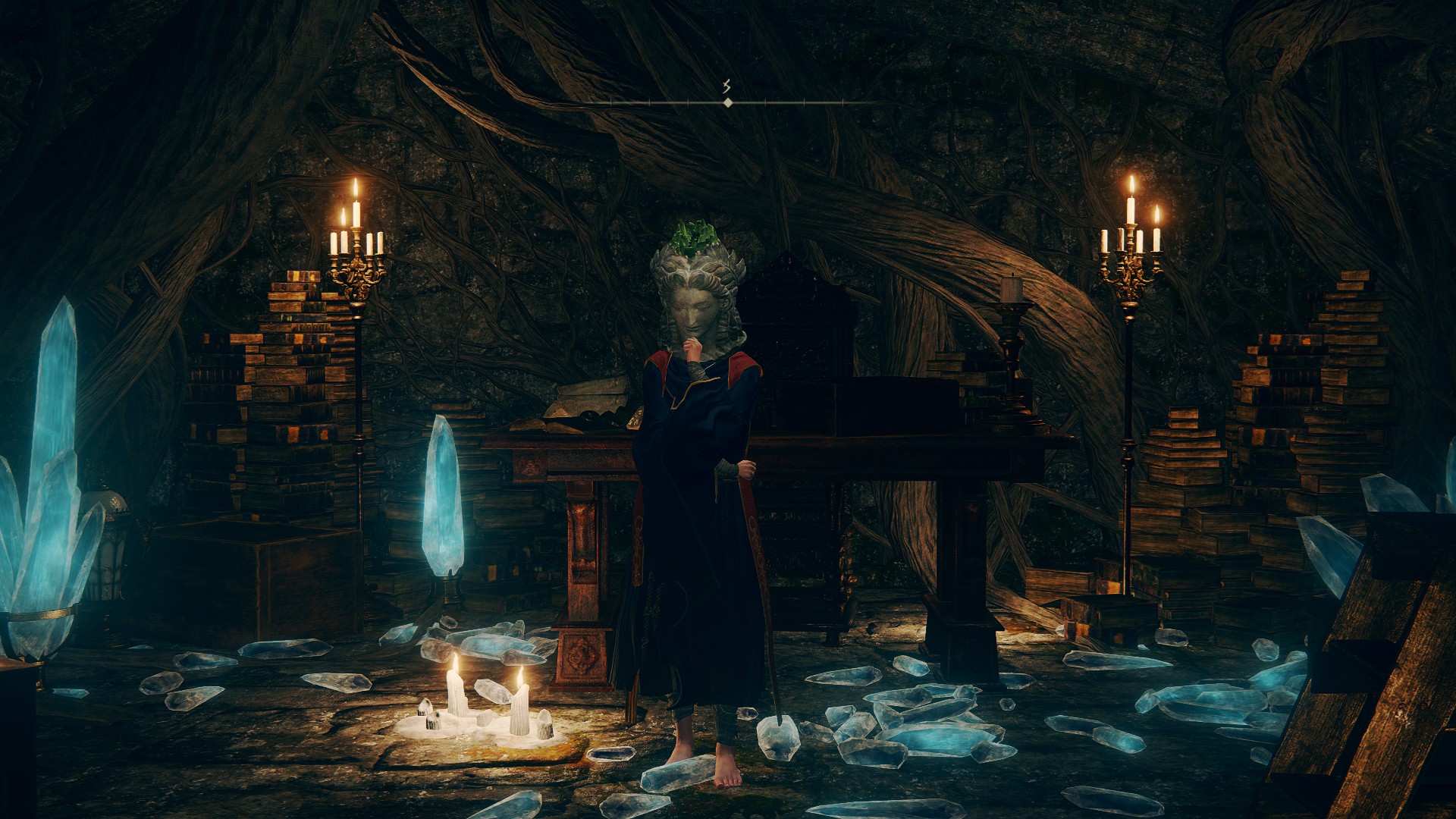 Tucked behind and to the right of Rennala will be another sphere or sorcerer heads: this is all Sellen’s quest has wrought for her. Reduced to a semi-mindless sphere or sorcerer souls, she can still teach you spells, and her helm, the Witch’s Glintstone Crown, will be sitting just in front of her.