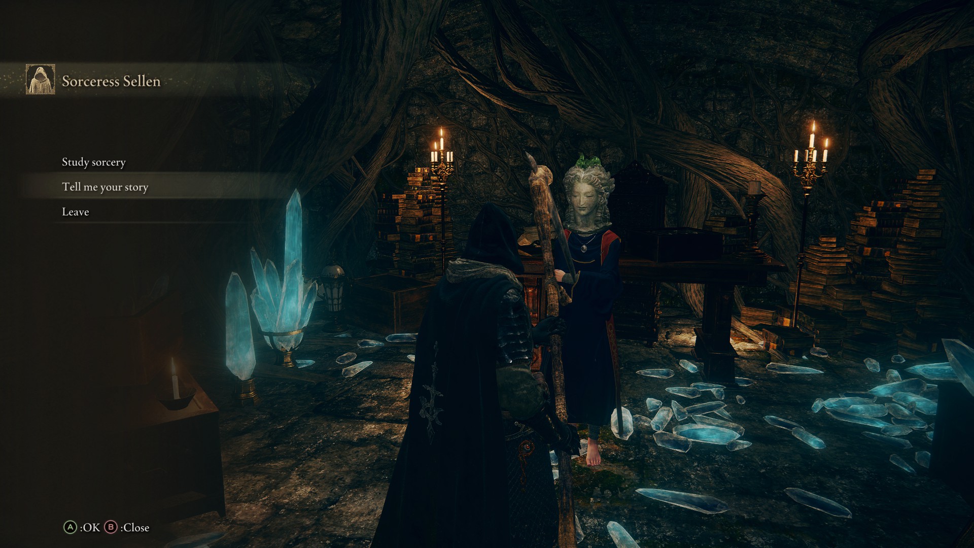 After hearing Sellen discuss Azur, select “Tell me your story” in her menu. She’ll give some background on herself and her goals, then ask you to join her on a journey to reclaim her place at Raya Lucaria.
