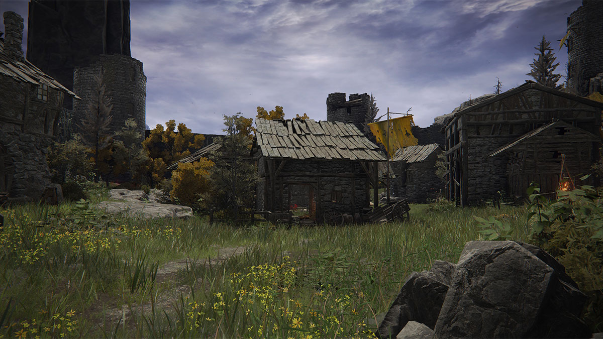 You’ll need to make a detour on your way up to kill the maddened nobles atop the tower on the east side of the upper area, as they’ll constantly summon a Madness ball that constantly increases your Madness bar and deals small but significant amounts of health damage. Once they’re dead, continue south until you round a corner and reach the Frenzied Flame Village. The first shack in front of you holds not only a few maddened enemies, but also the Frenzied’s Cookbook [1] on a corpse with a purple shiny loot item.