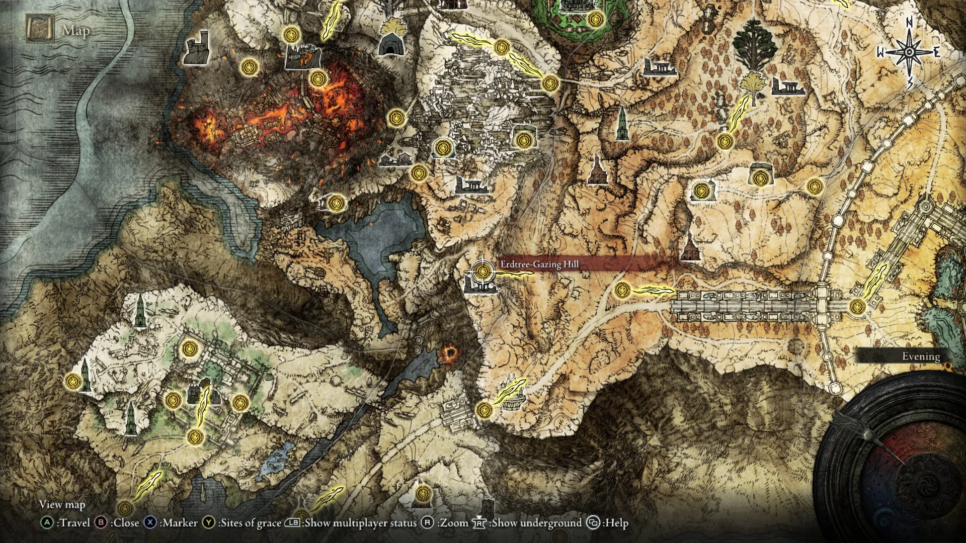 - First brazier location: From the Evergaol entrance, head south until you reach a broken wall just before the road. Jump up on the broken bits until you’re on the roof, and be mindful of the archers. Travel along the rooftops until you reach the ladder leading to the brazier.