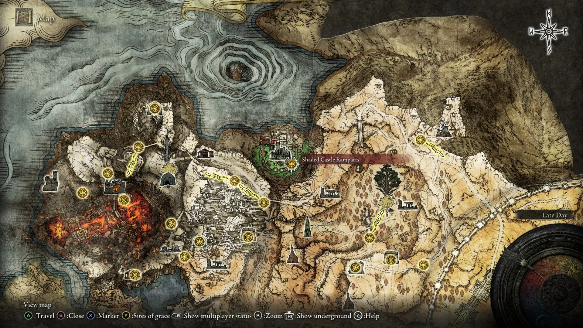 Your next stop is the Shaded Castle in the Altus Plateau. Starting from the Grand Lift of Rold, follow the ravine path north until you reach a castle in a Miyazaki-Special poison swamp.